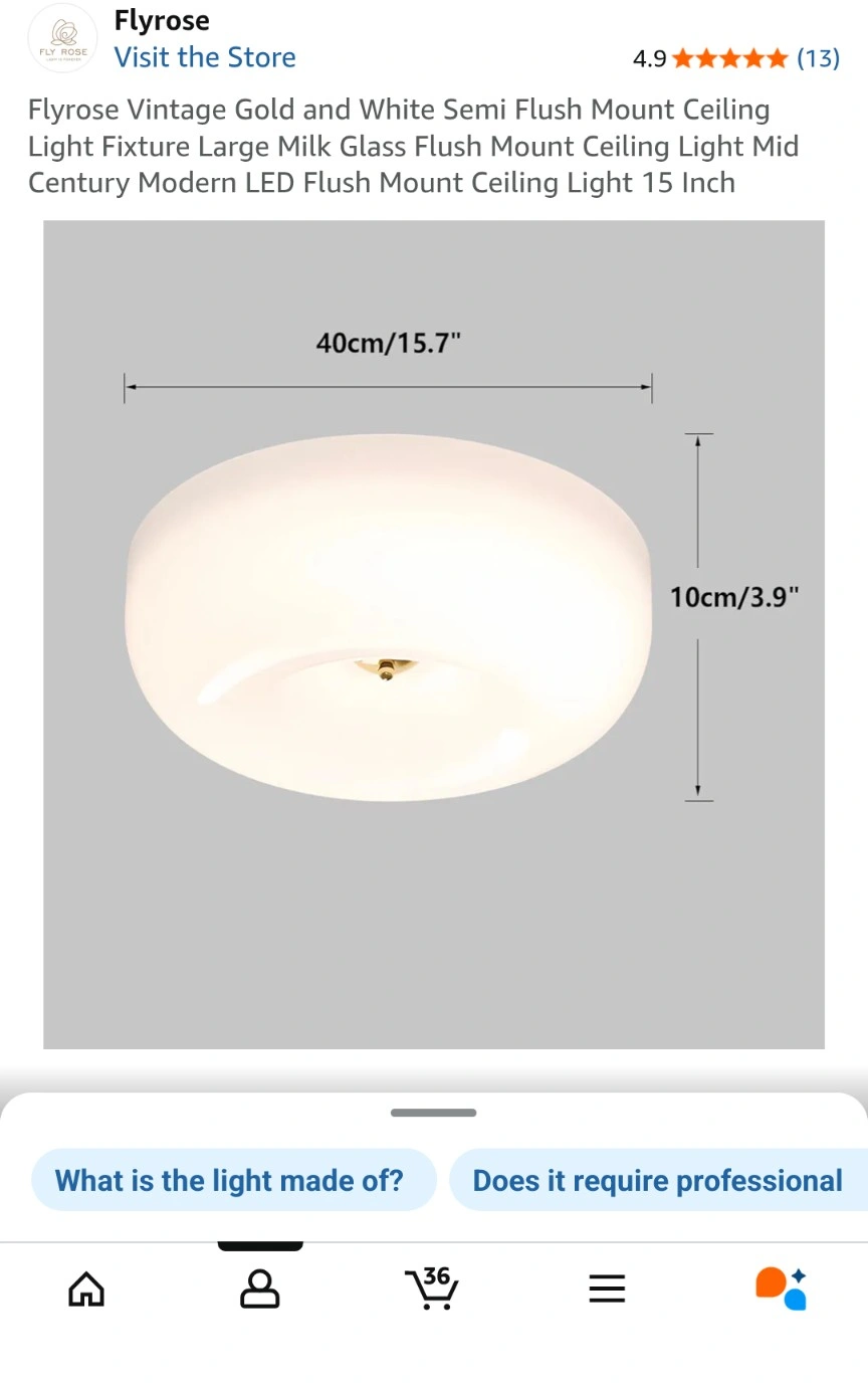 Selling a Flyrose vintage gold and white semi-flush mount ceiling light fixture. It features a large milk glass flush mount and has a mid-century modern LED design. The light is 15 inches in diameter.