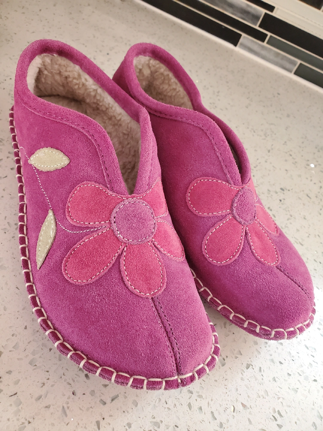 Cozy up with these Foamtreads slippers! They are a lovely purple suede with a soft, warm lining. Perfect for keeping your feet comfy and warm on chilly days