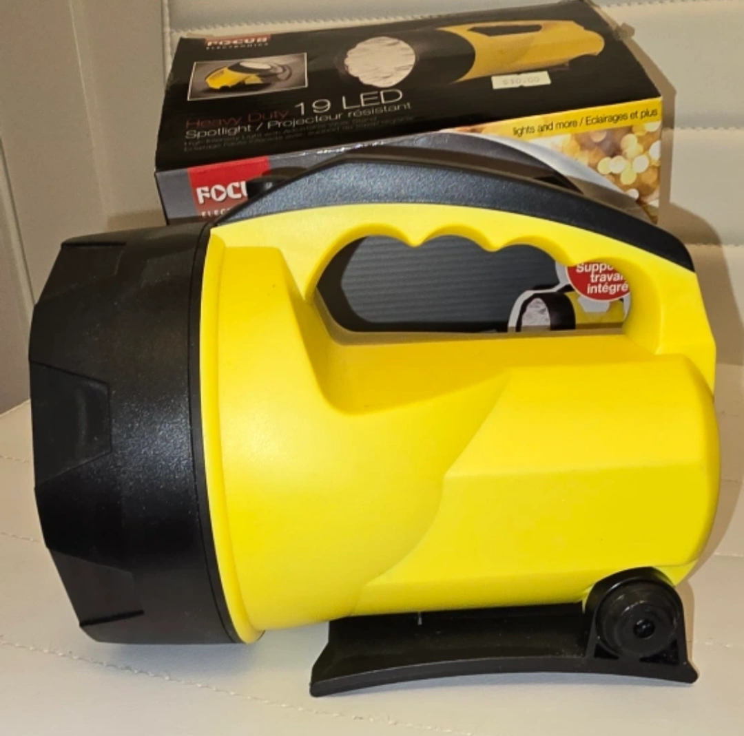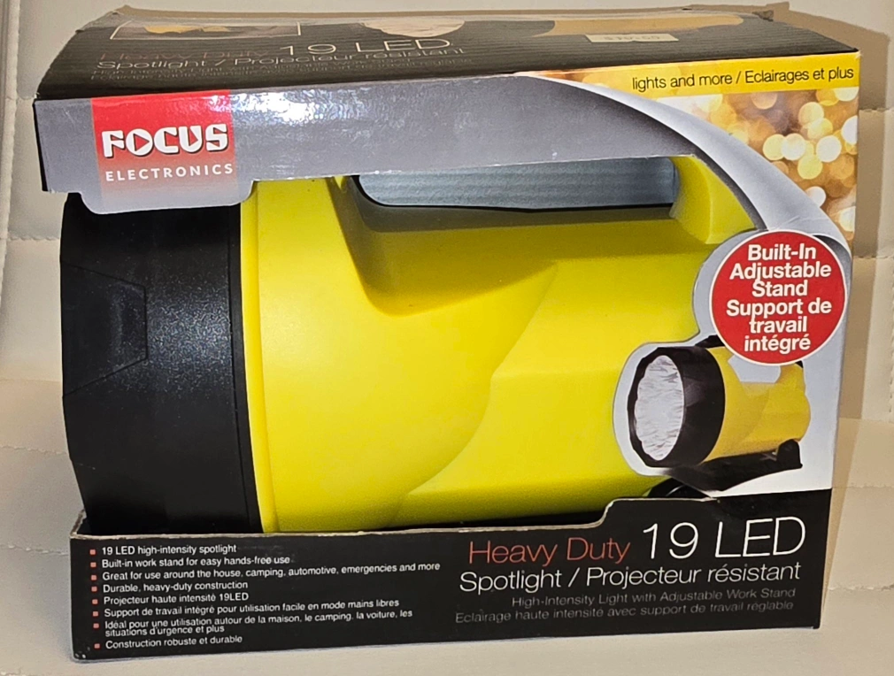 19 LED spotlight. Built-in adjustable stand. Great for easy hands-free use. Durable, heavy-duty construction. Ideal for use around the house, camping, automotive, emergencies and more. Color: Yellow and black Requires 4 size D batteries
