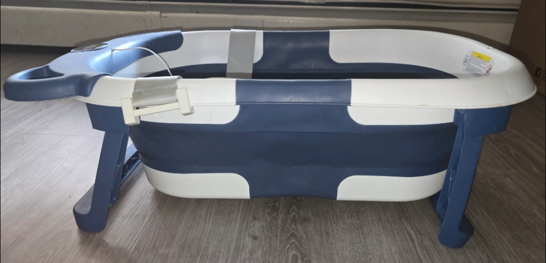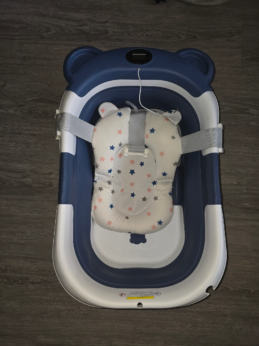 Gently used foldable baby bathtub, perfect for easy storage and travel! The tub comes with a supportive bath cushion to keep your little one comfy during bath time. It's in great condition and ready for a new home