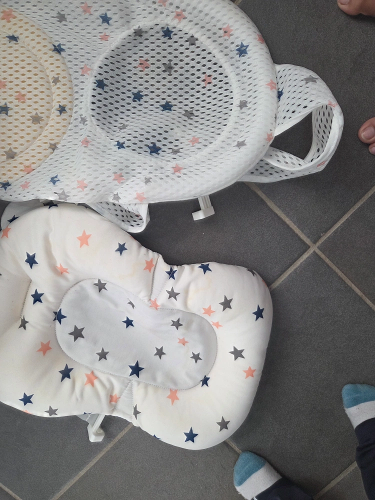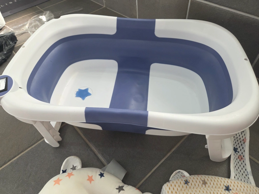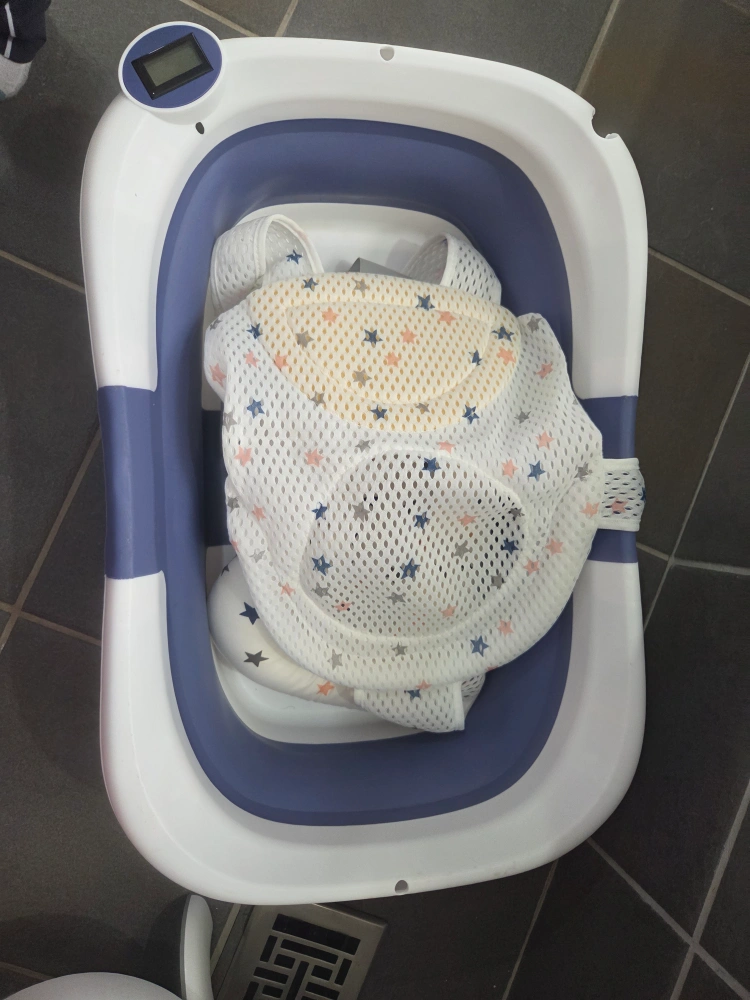 Selling a foldable baby bathtub in good condition. It comes with a bath support seat. The bathtub is white and blue. It's perfect for small spaces and easy to store away when not in use.