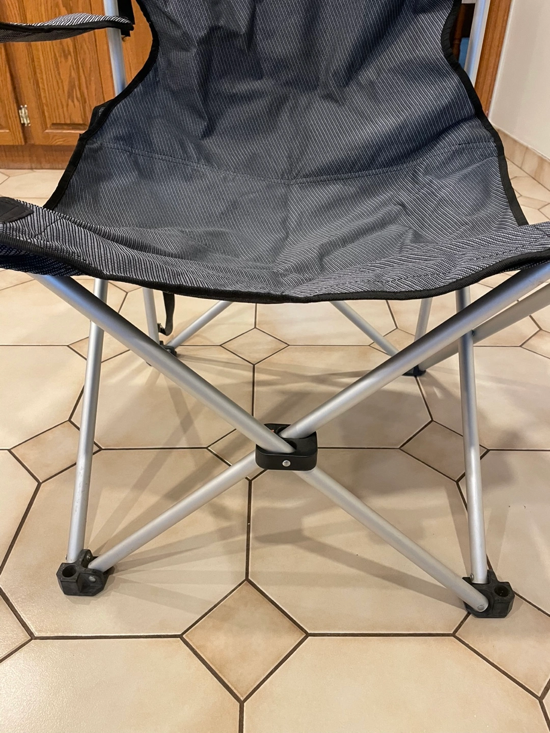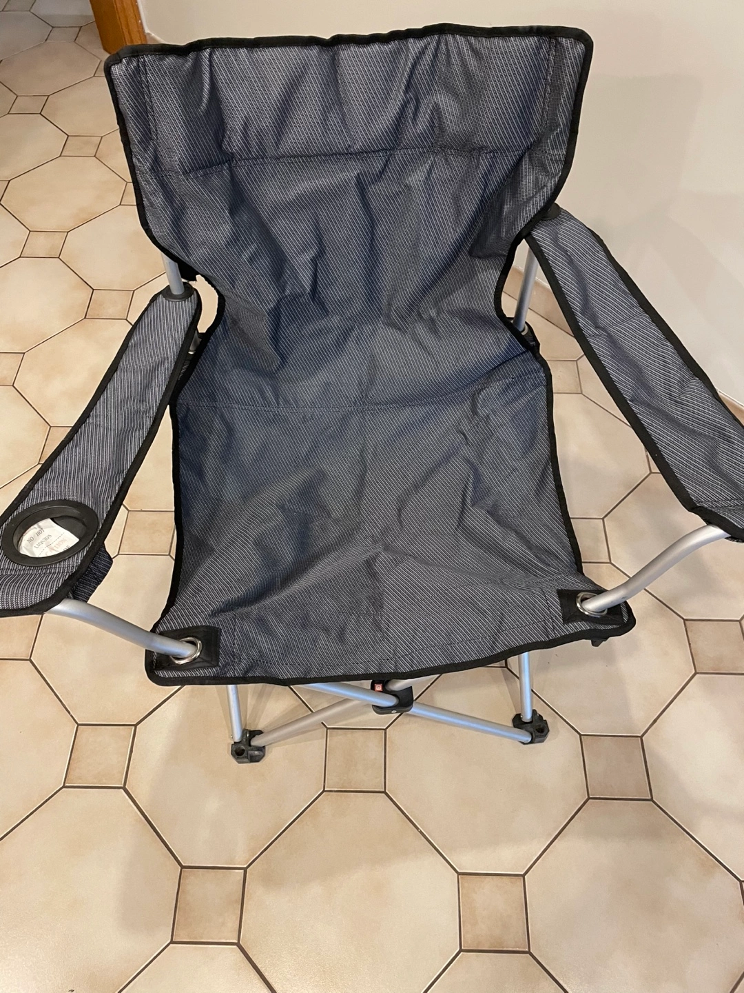 A folding chair featuring a neutral colour with silver legs. Includes armrests and a cup holder. It's a great option to relax on a sunny afternoon outdoors.