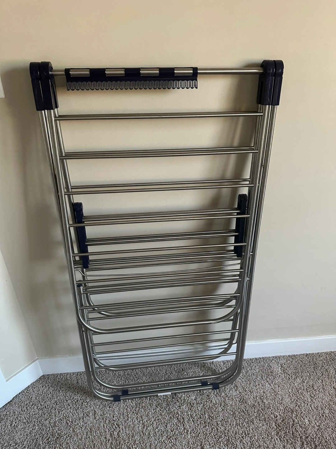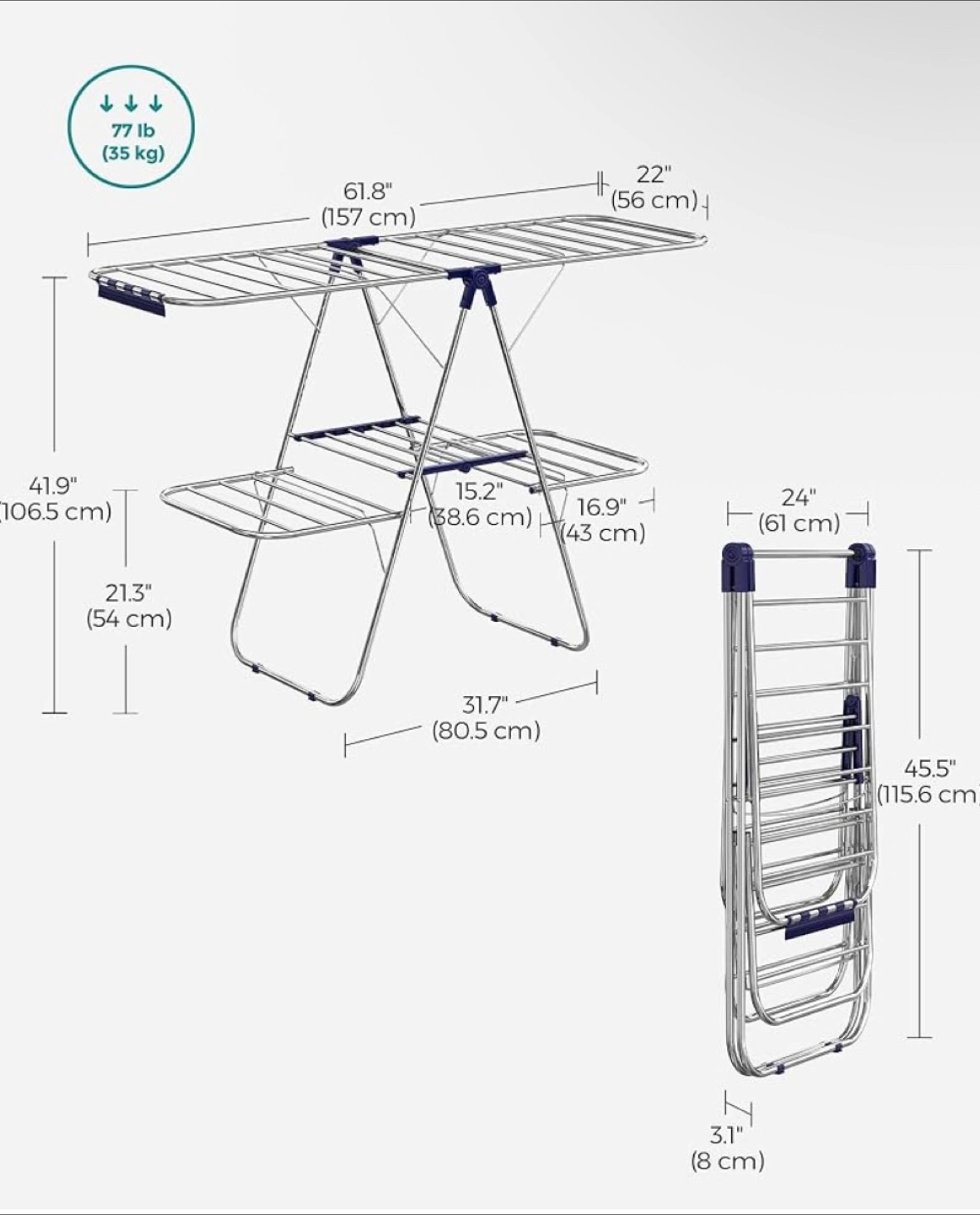 This foldable clothes drying rack is perfect for saving space! It's made of stainless steel, so it's durable and rust-resistant. When fully open, it measures 61.8" (157 cm) wide and 41.9" (106.5 cm) tall. When folded, it's only 3.1" (8 cm) thick for easy storage