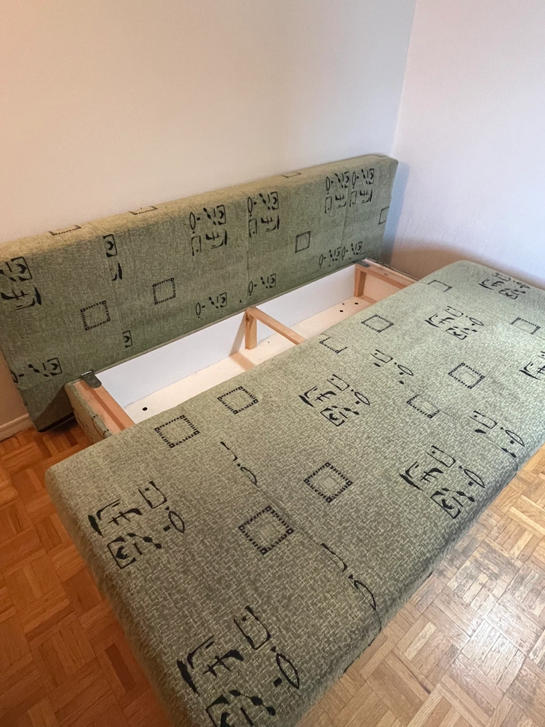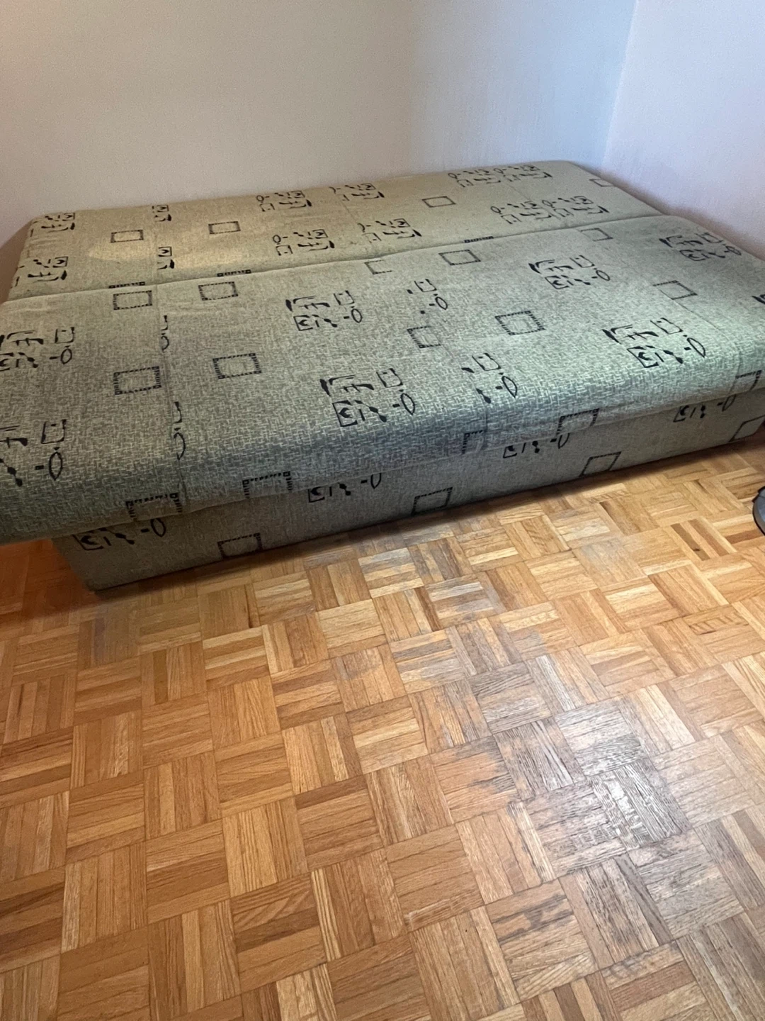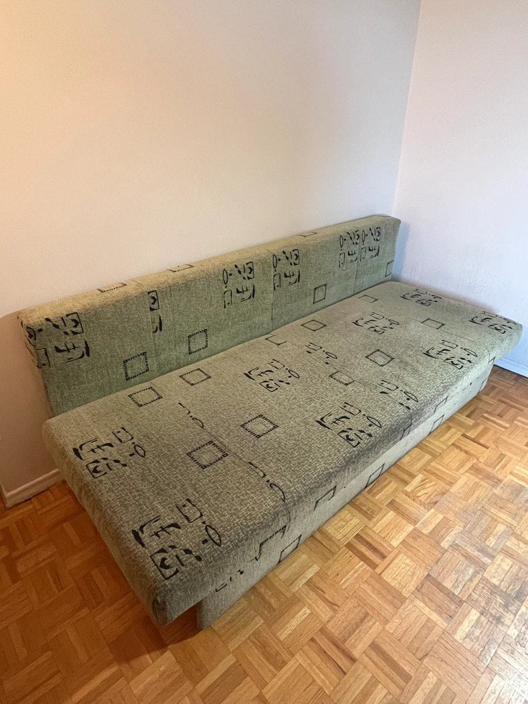 Selling a foldable sofa bed in a green and black patterned fabric! It's perfect for accommodating guests or for smaller spaces where you need versatile furniture. It shows some signs of use but is still functional and comfortable. 76 in length 35in width with back 56 in width open condition 15 in height of the seat