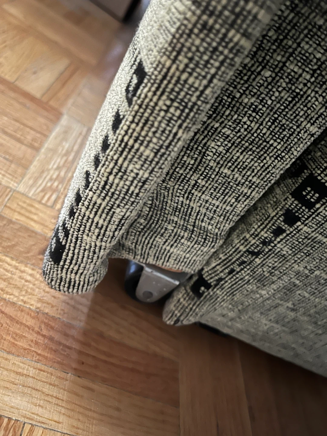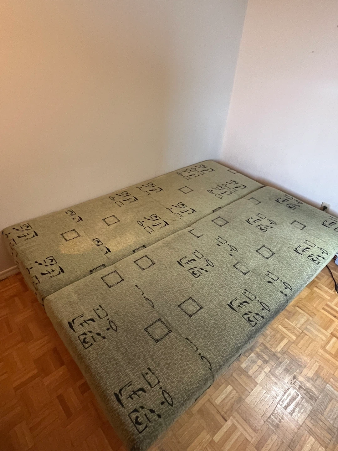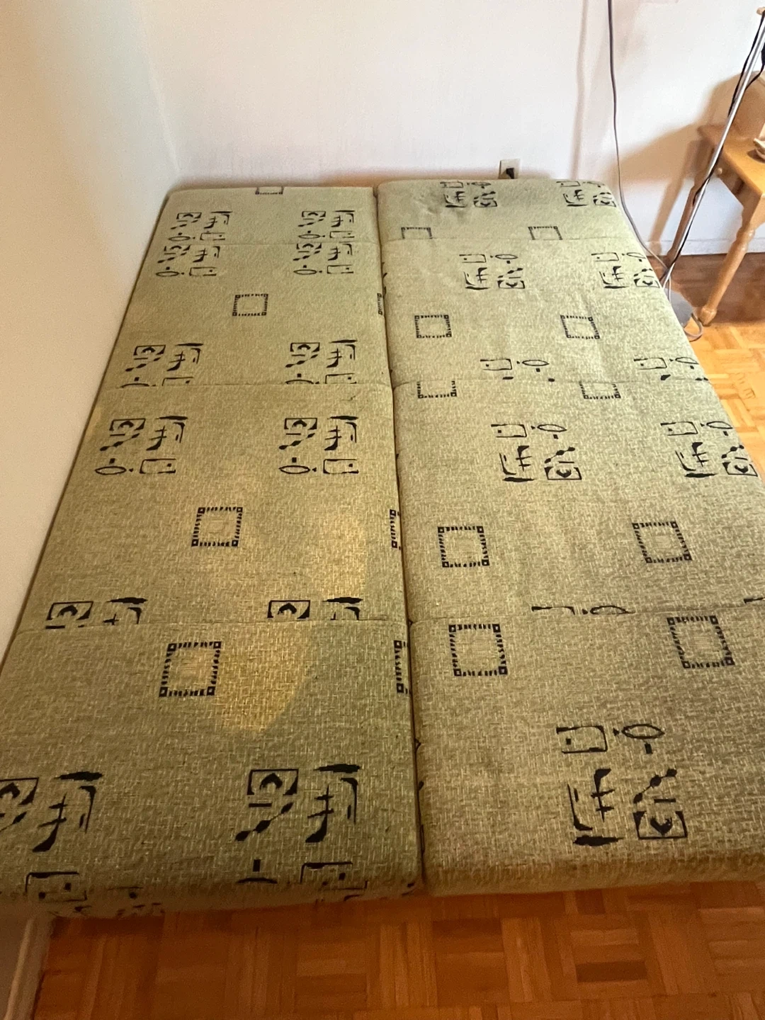 Selling a foldable sofa bed in a green and black patterned fabric! It's perfect for accommodating guests or for smaller spaces where you need versatile furniture. It shows some signs of use but is still functional and comfortable. 76 in length 35in width with back 56 in width open condition 15 in height of the seat