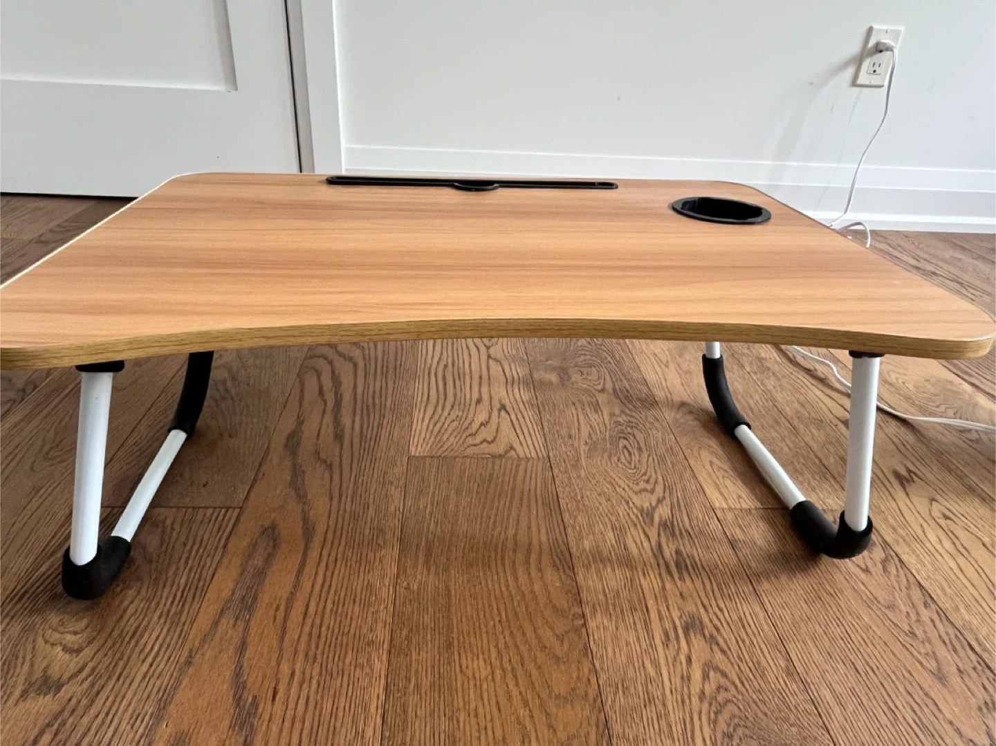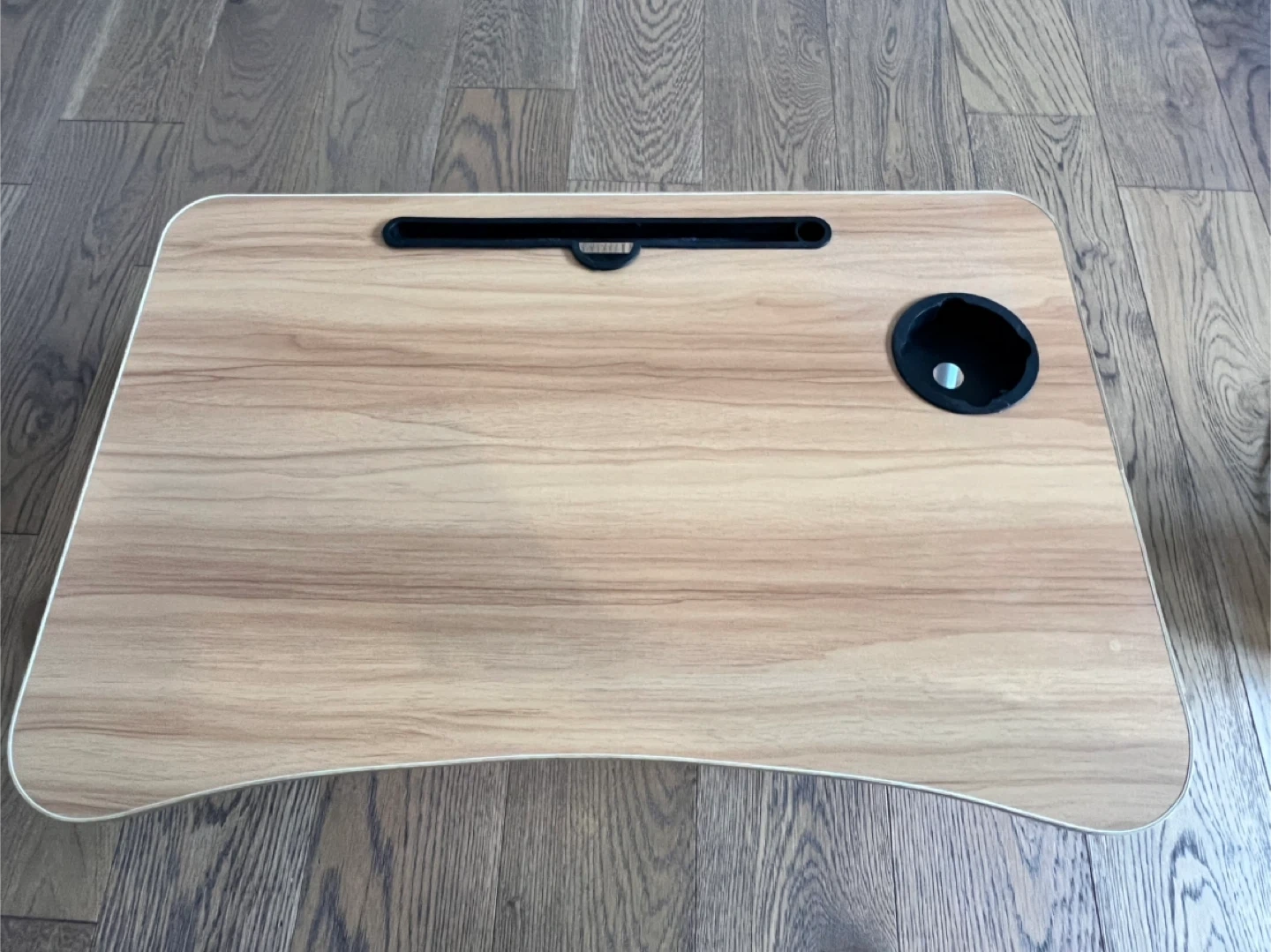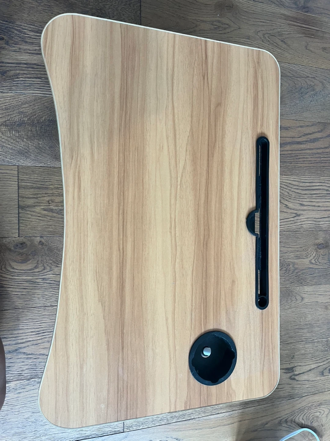 Selling a foldable bed desk, perfect for working or relaxing in bed! It features a convenient cup holder and a slot for holding a tablet or book. The desk is lightweight and easy to store when not in use. Great for students or anyone who enjoys breakfast in bed! Has rubber holding so it is very stable