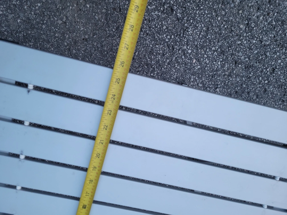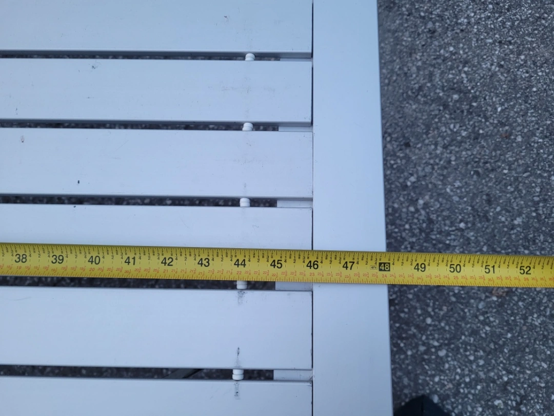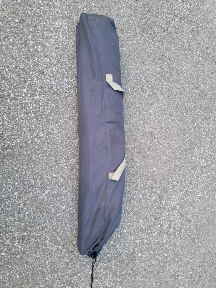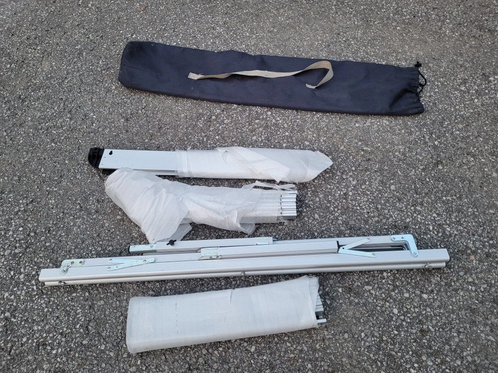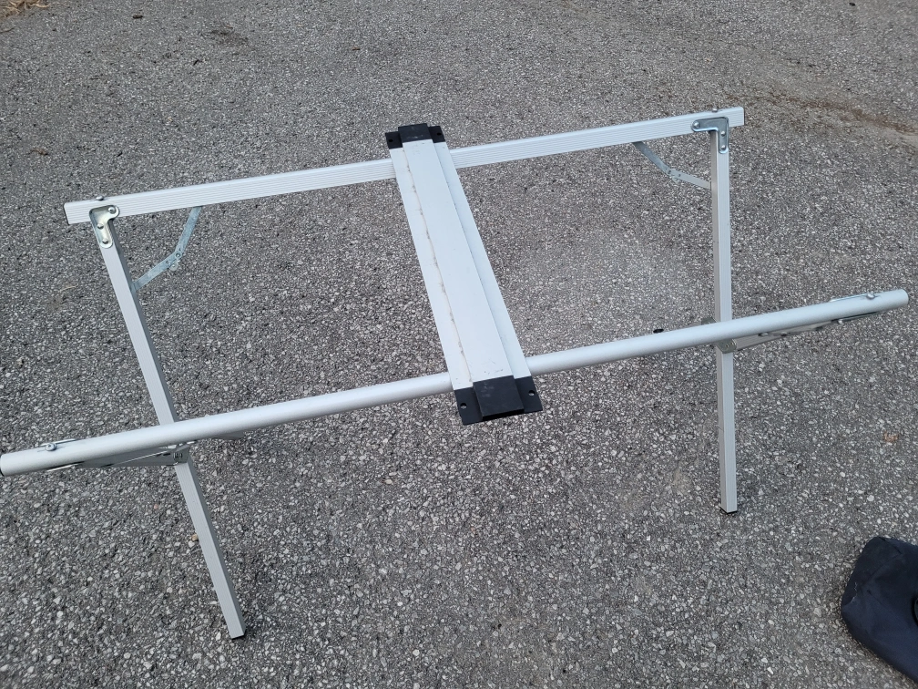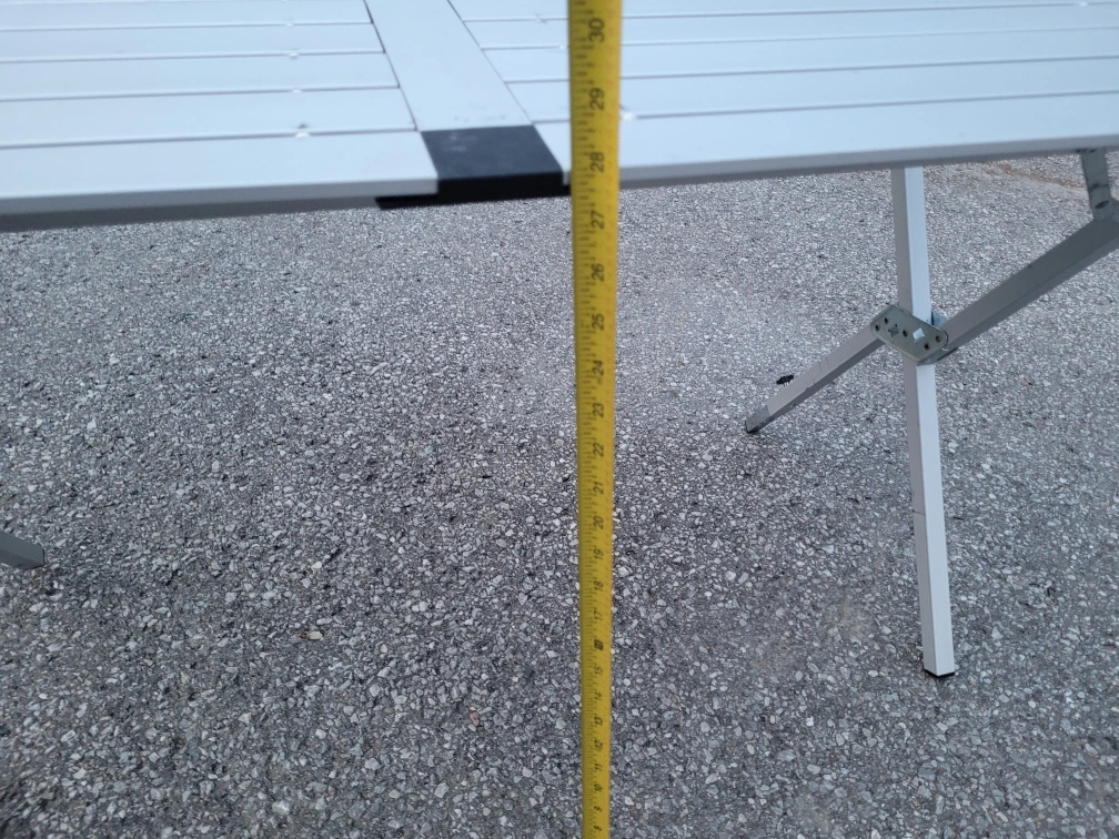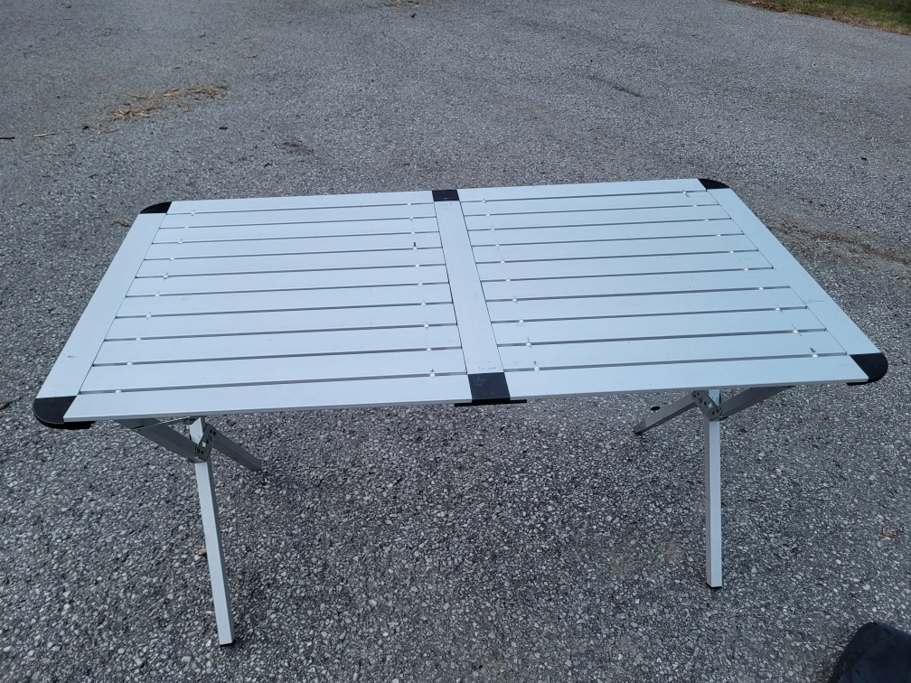 This aluminum camping table folds up for easy storage. It is approximately 48 inches long, 28 inches tall, and 25 inches wide. It comes with a carrying case.
