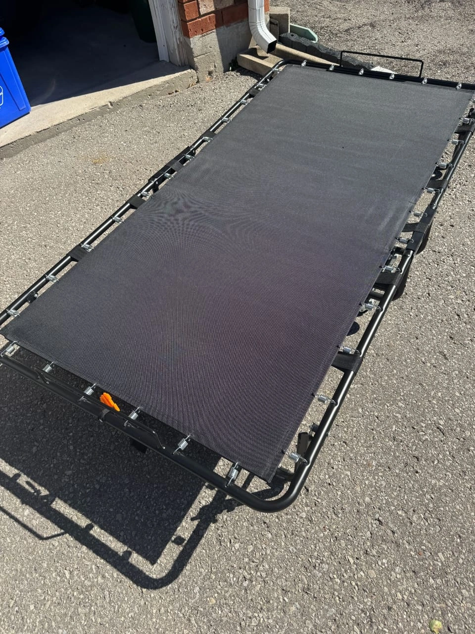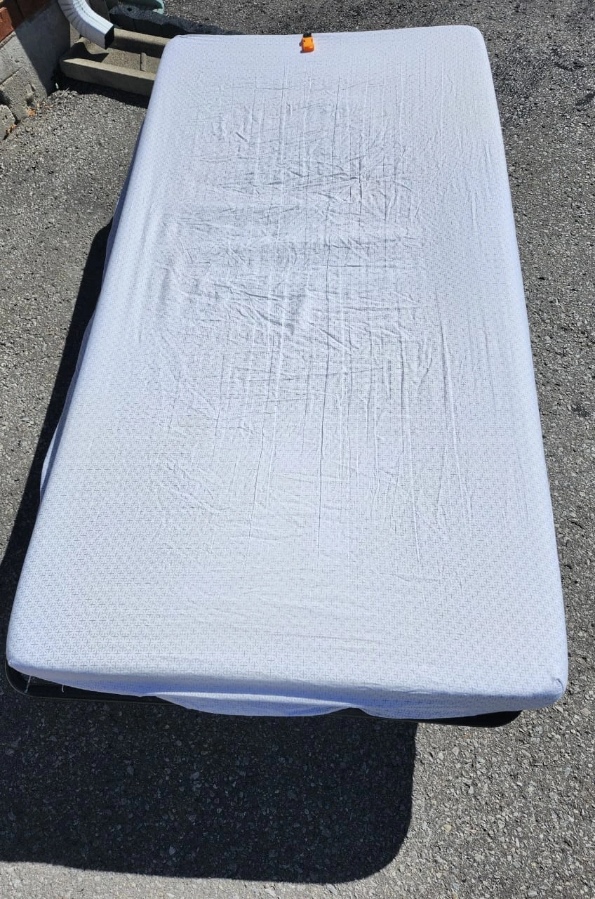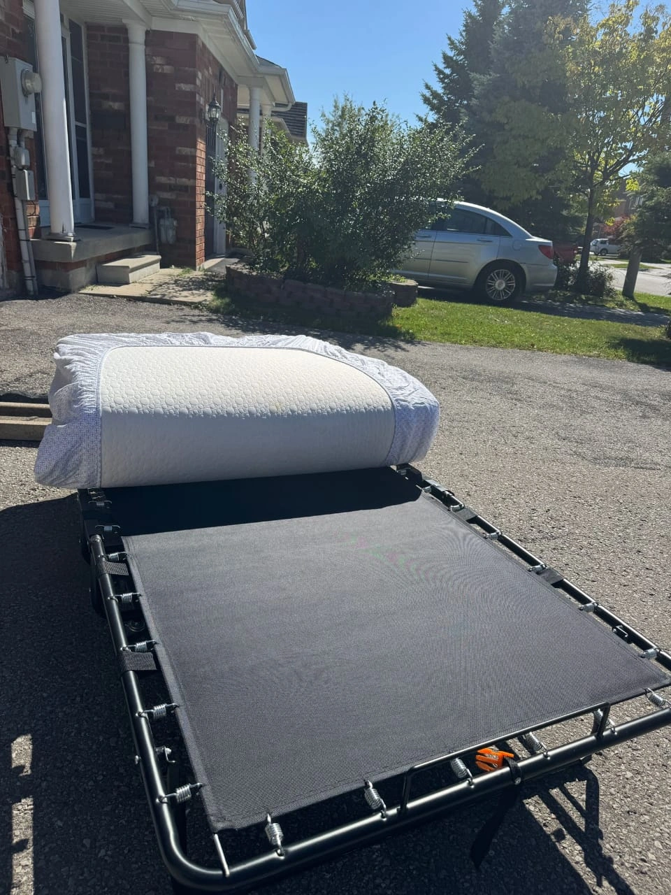 Selling a folding bed frame that comes with a mattress. It's in good condition and perfect for guests or small spaces. The frame is easy to fold up and store when not in use. The mattress is comfortable and clean. Ready for pick up!
