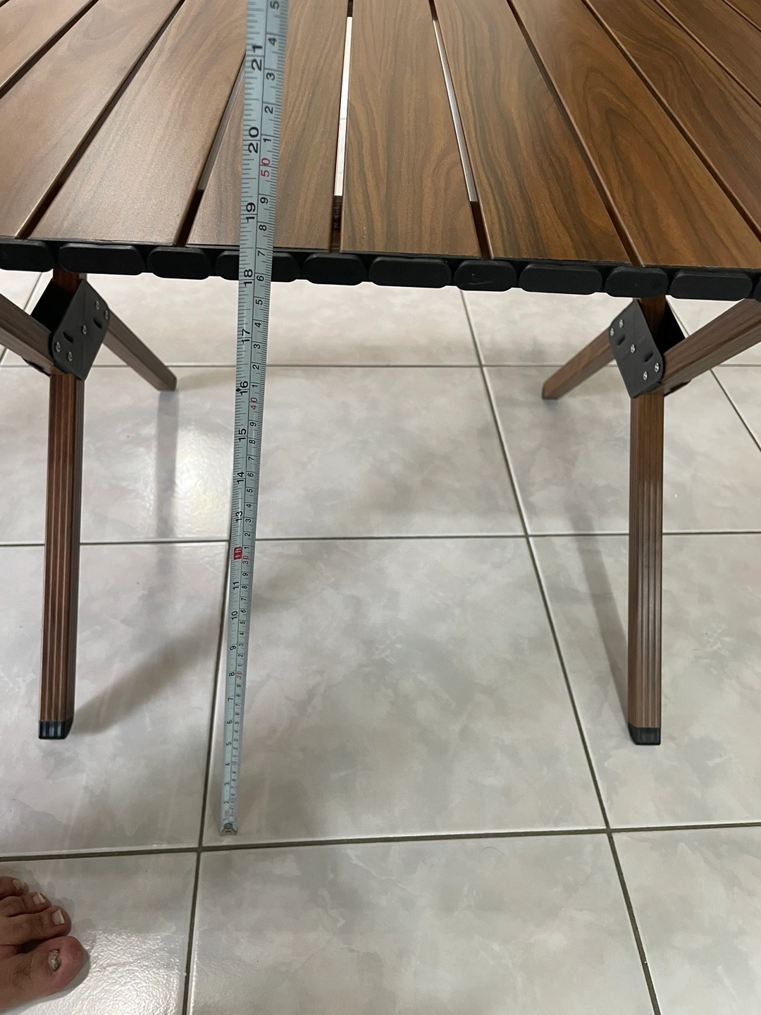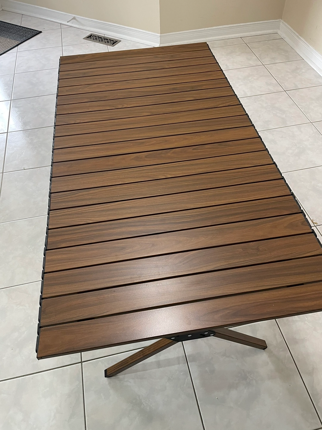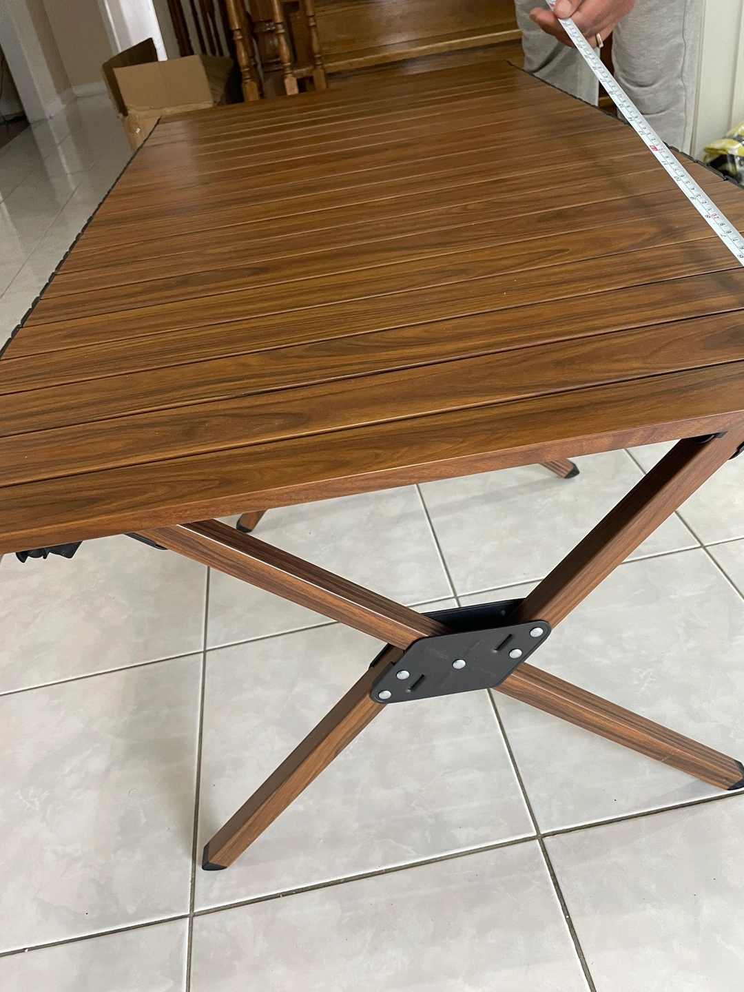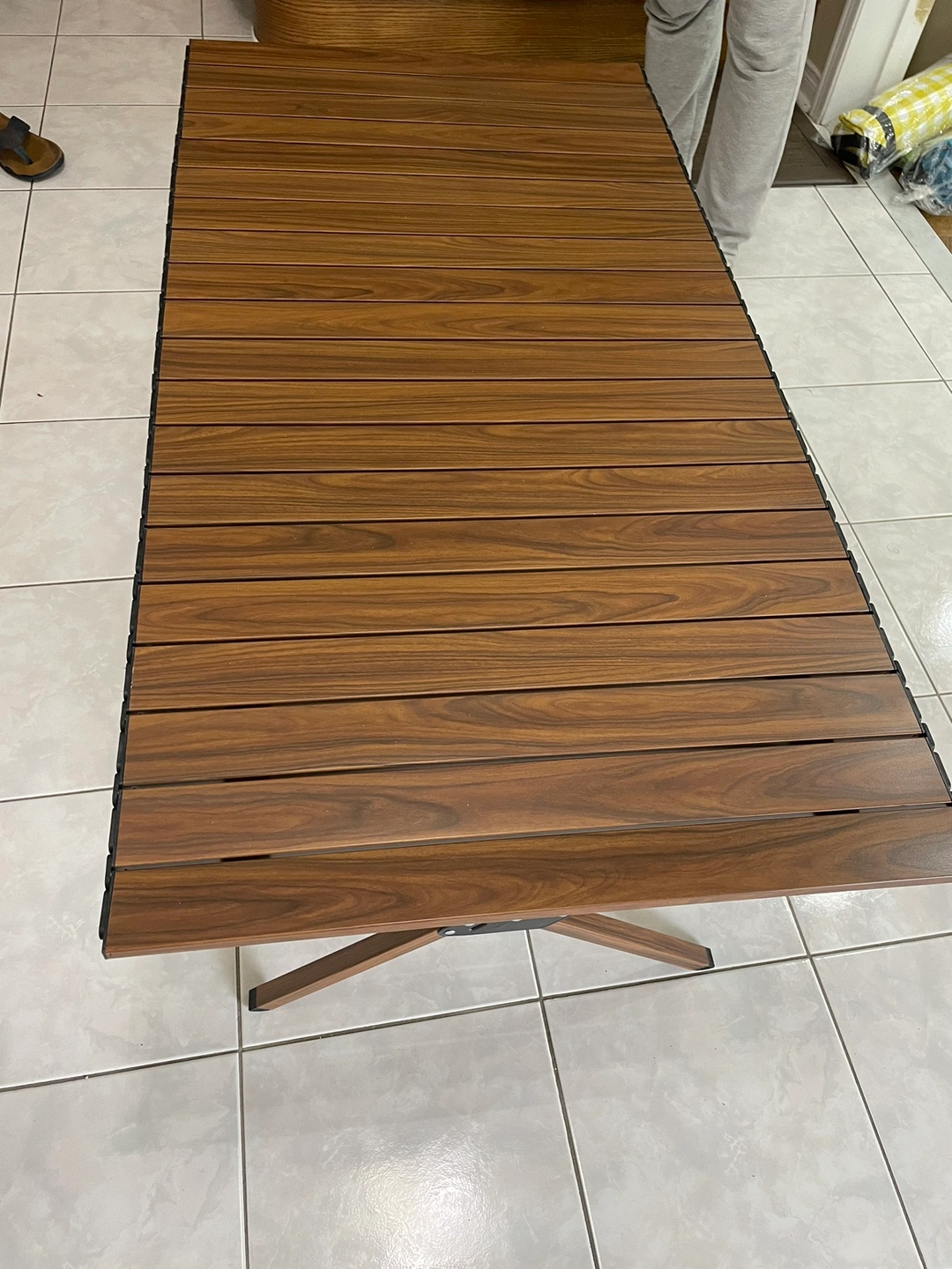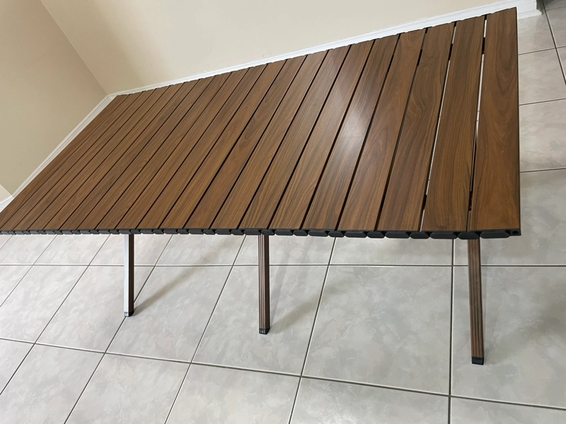 A folding camping table. It is made of aluminum and has a woodgrain finish. It has a cross-shaped base. It is lightweight and easy to store. It can be used to indoor aswell for more space gathering.