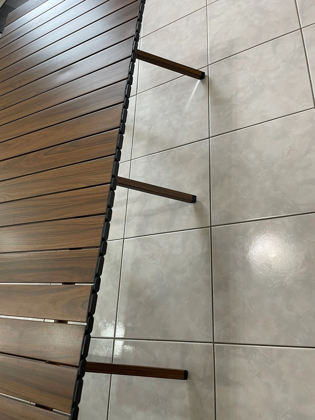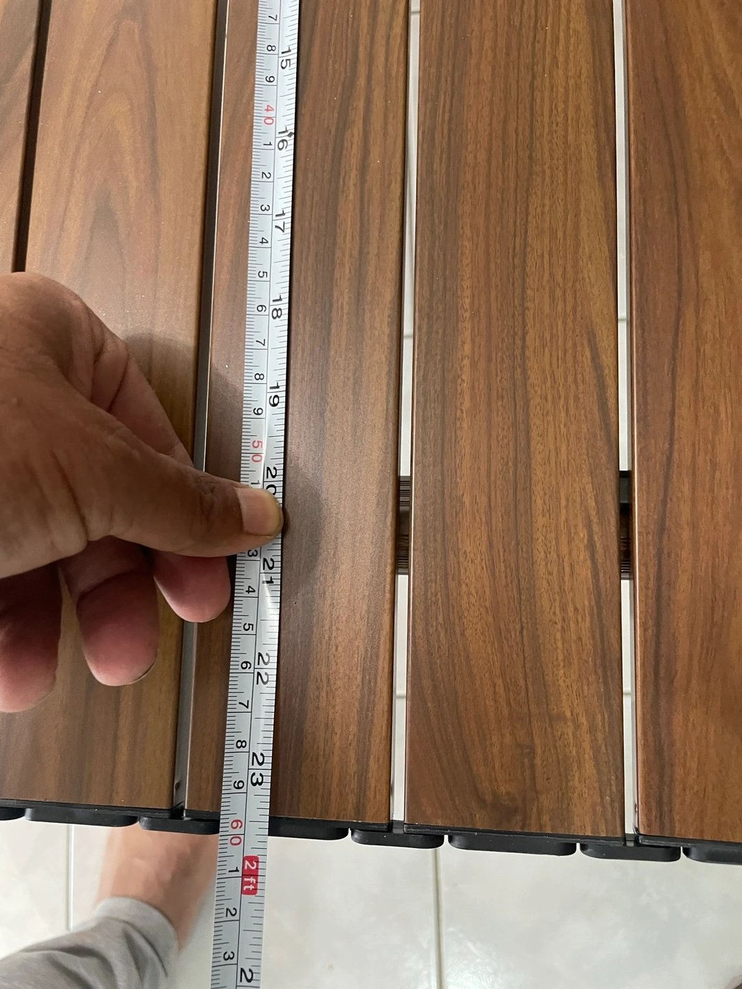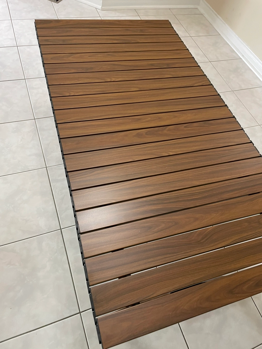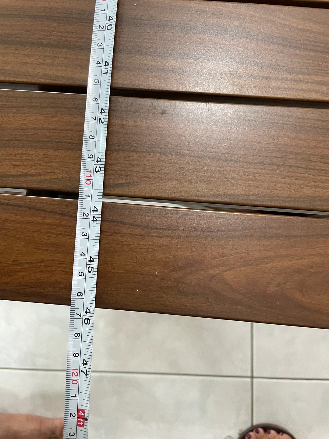 A folding camping table. It is made of aluminum and has a woodgrain finish. It has a cross-shaped base. It is lightweight and easy to store. It can be used to indoor aswell for more space gathering.