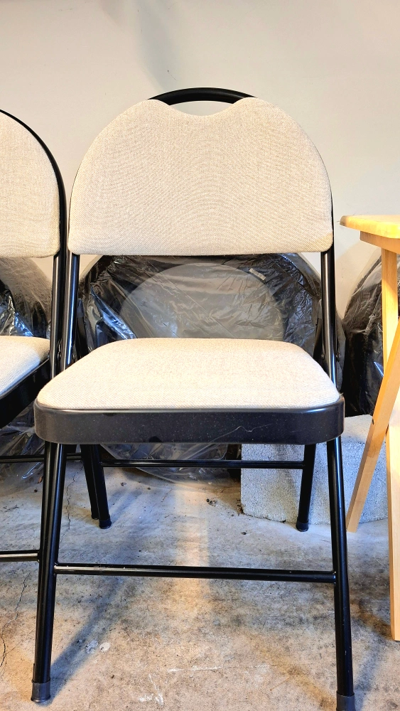 Selling five folding chair with a beige fabric seat and a black metal frame. It's in good condition and perfect for extra seating when you have guests or for events. You can buy all five or just one.