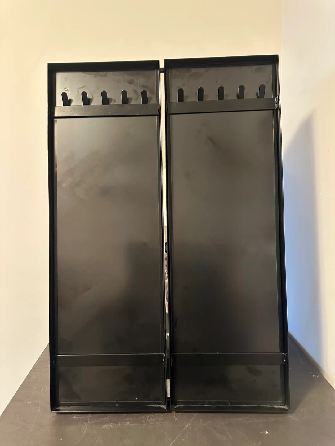 Selling a tri-fold vanity mirror in black. Self-standing, near-perfect condition. Has jewelry hooks on the front panels as well. model: IKEA Karmsund