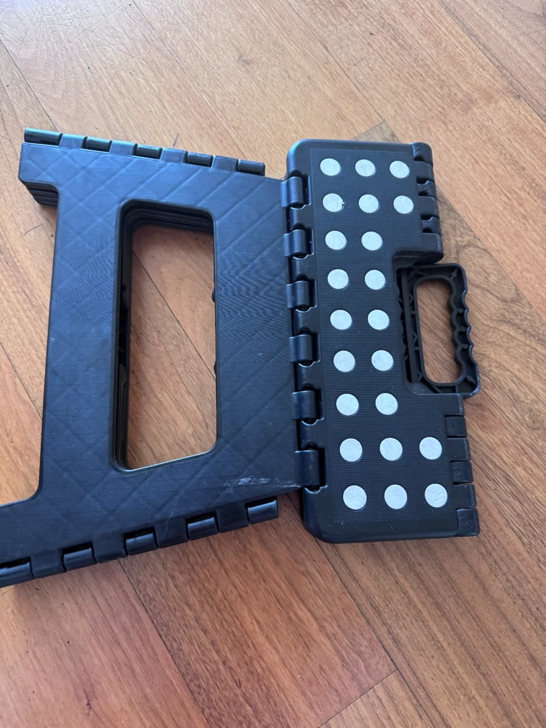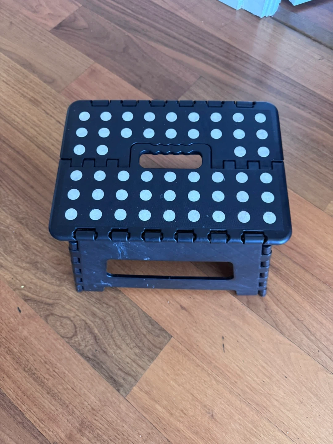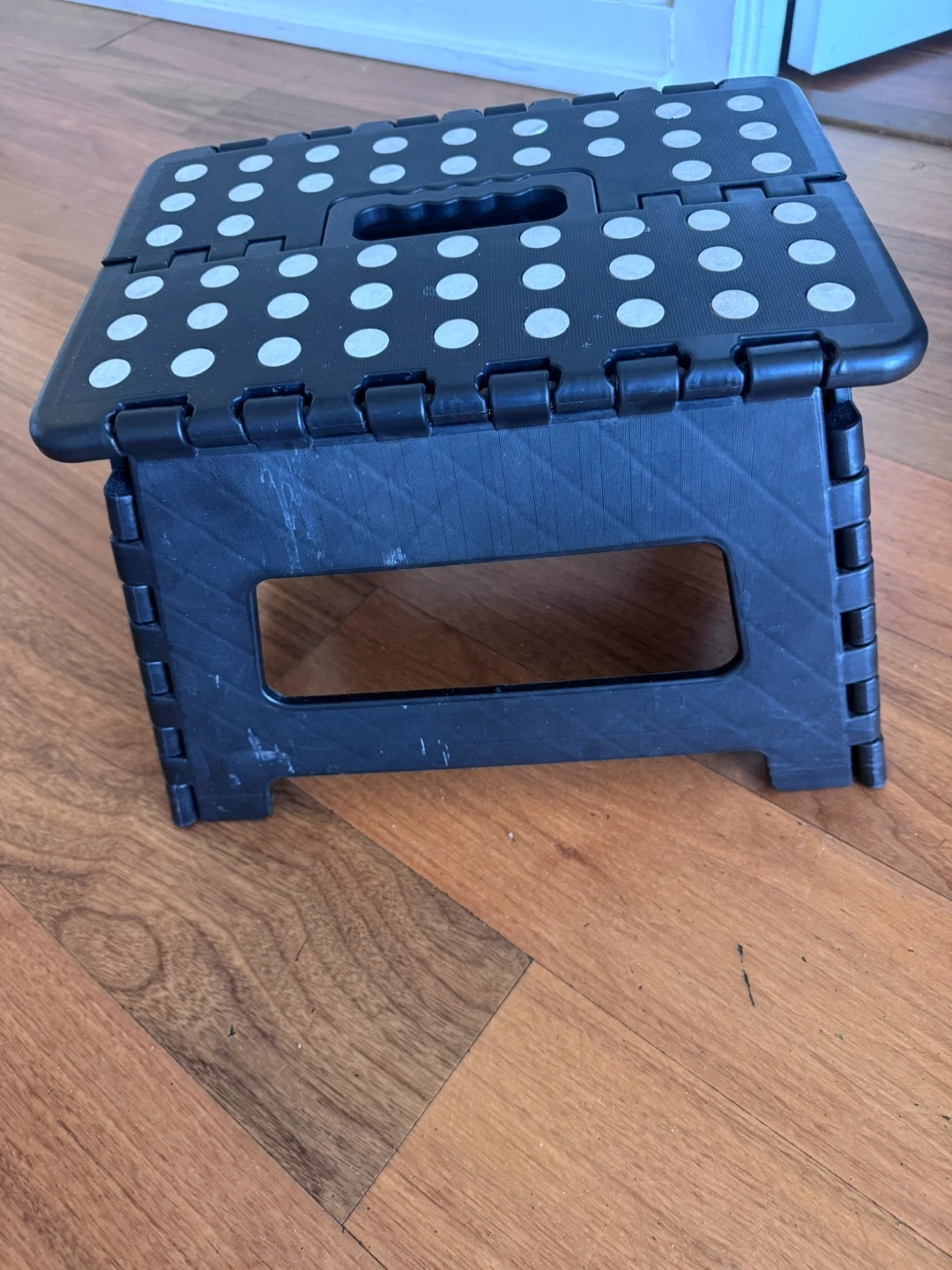 This is a handy folding step stool in black. It's perfect for reaching those high shelves or for a little extra boost. It's lightweight and easy to store, making it a great addition to any home!