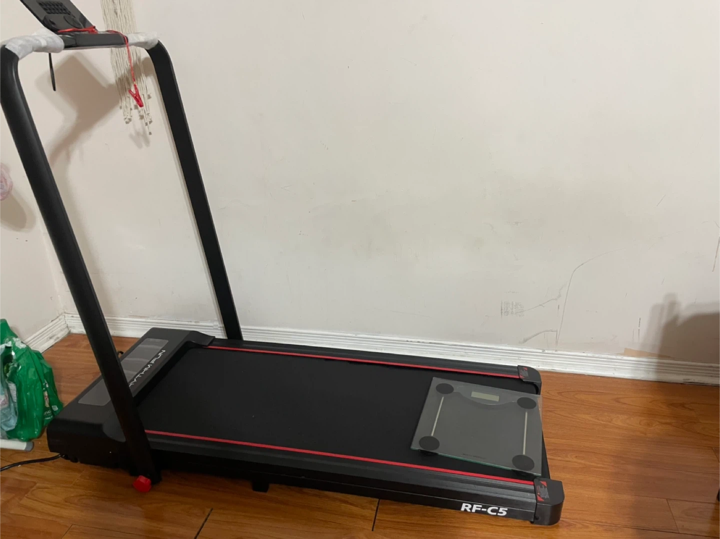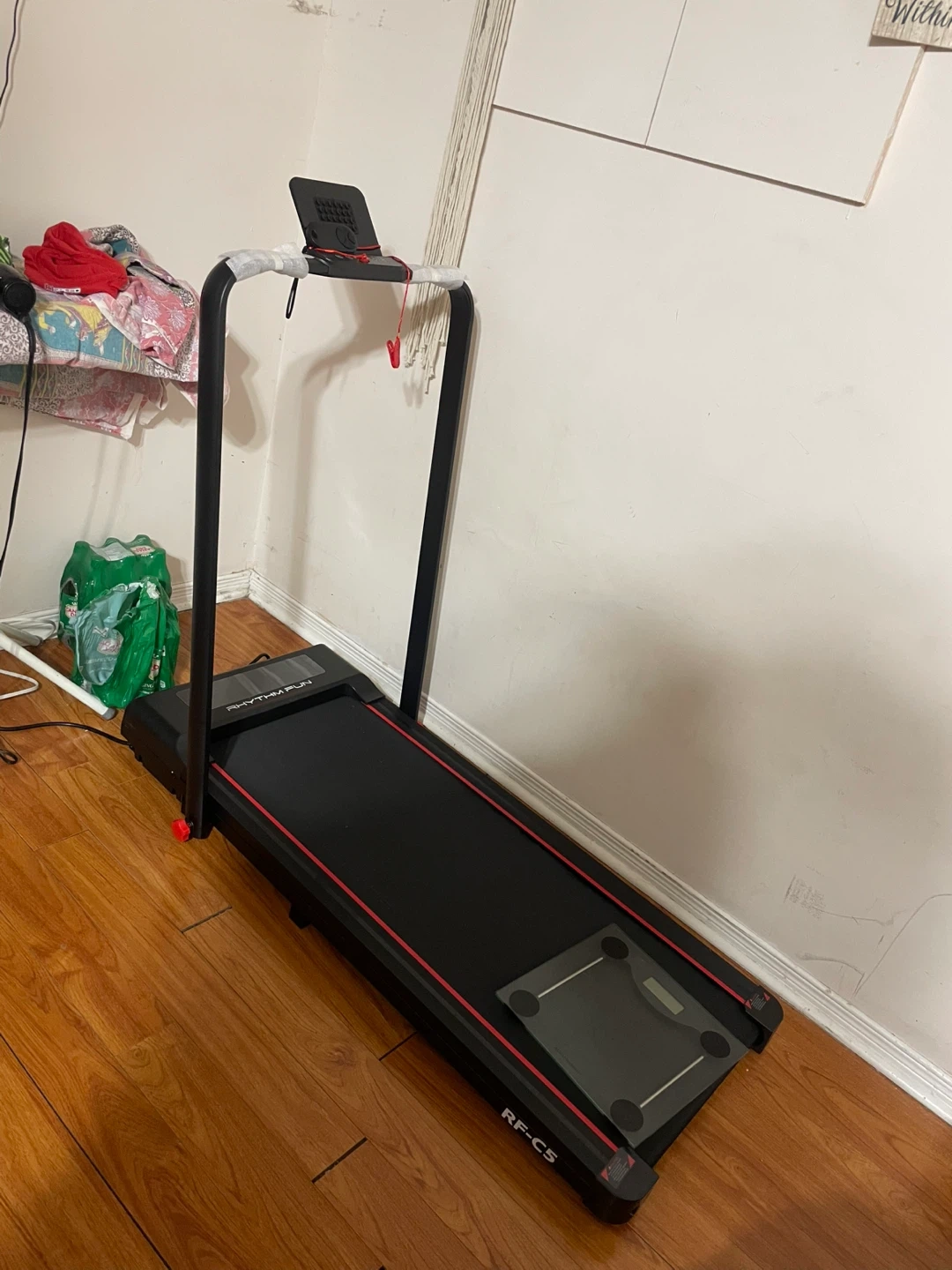 Selling a folding treadmill in black and red! It's in great shape and ready for a new home gym. It also has a scale attached to it!