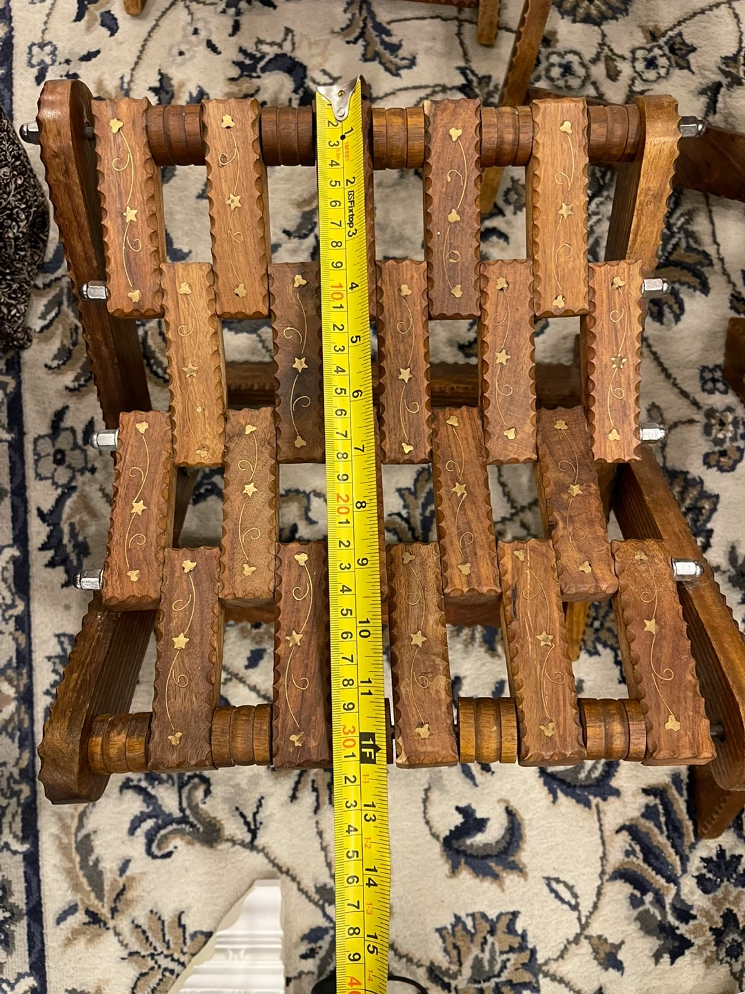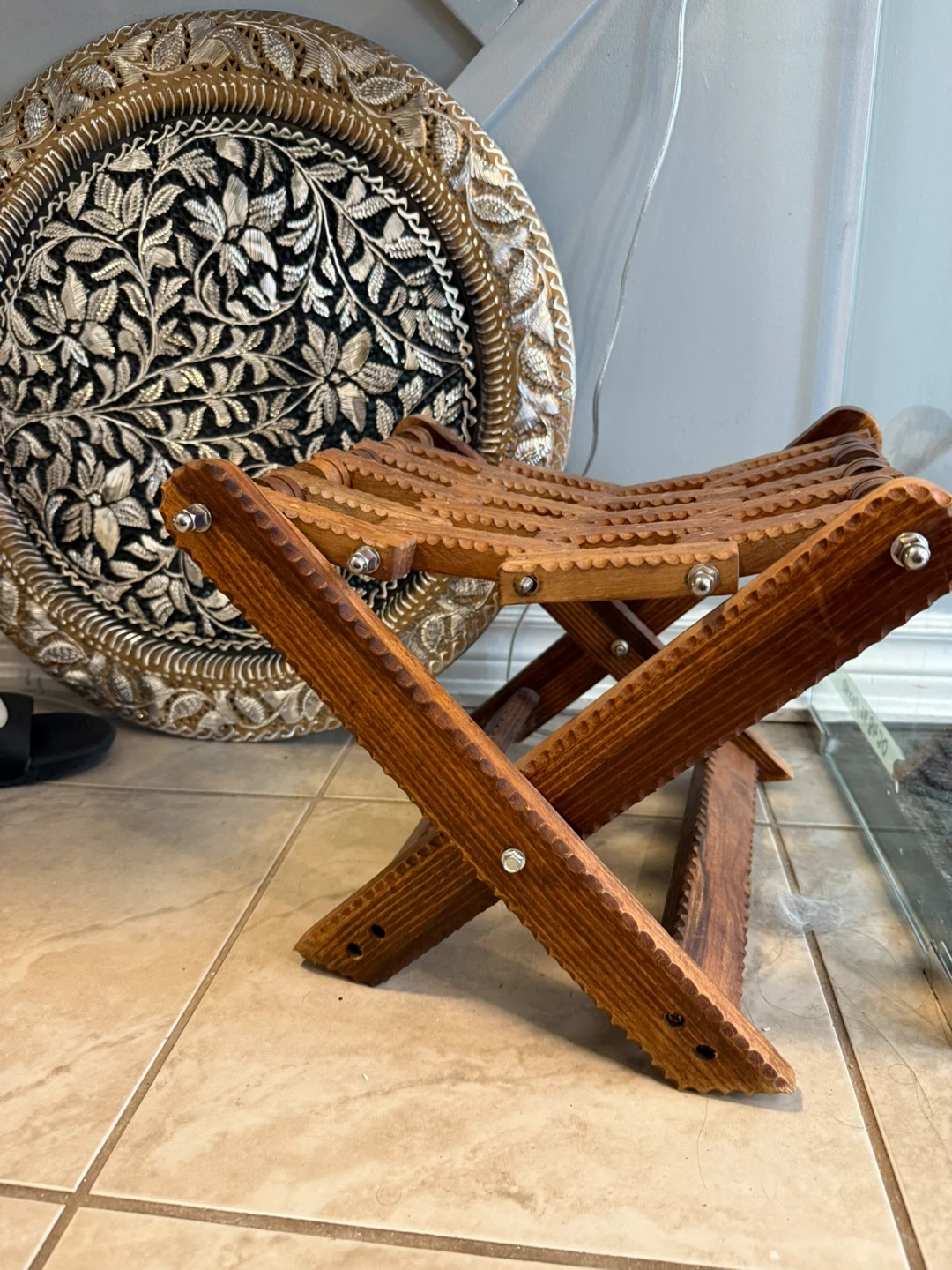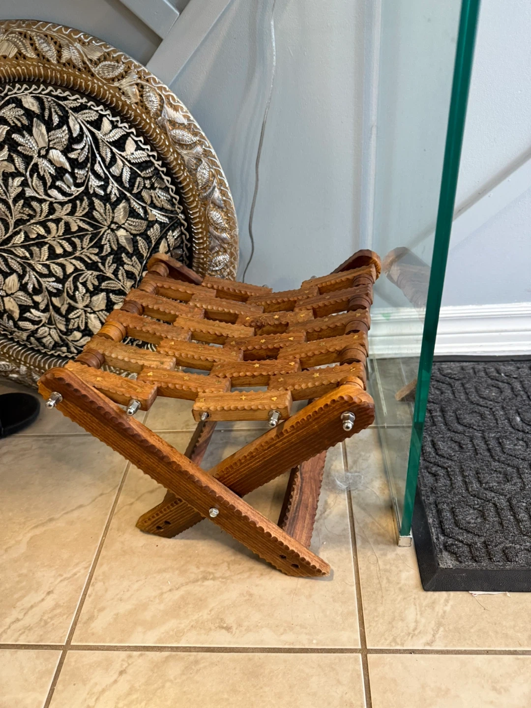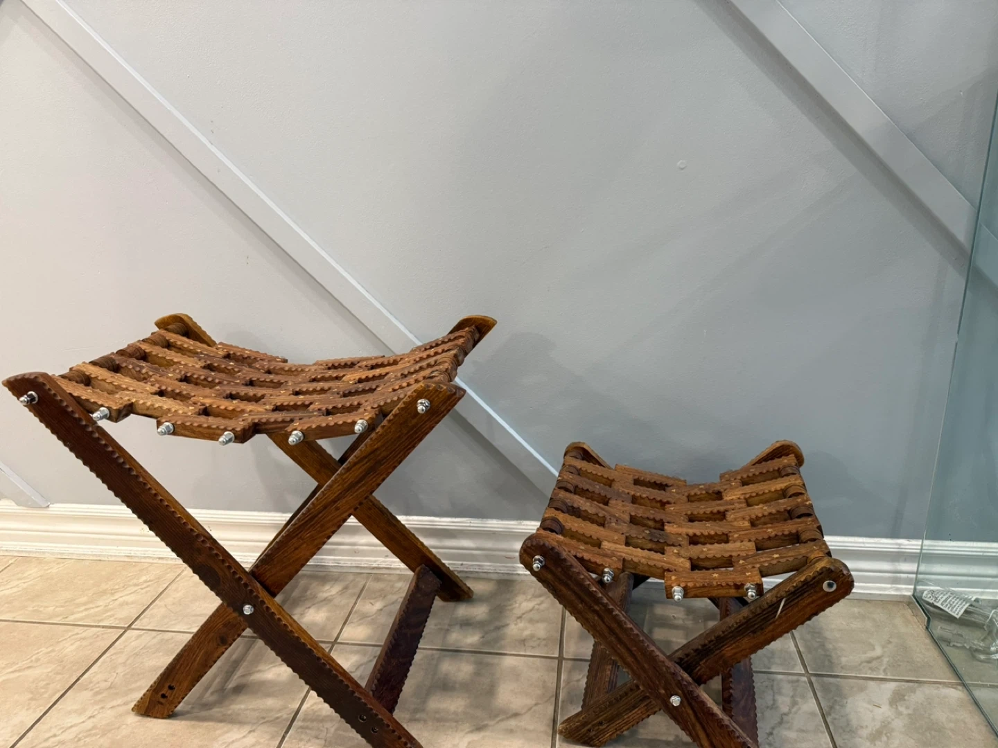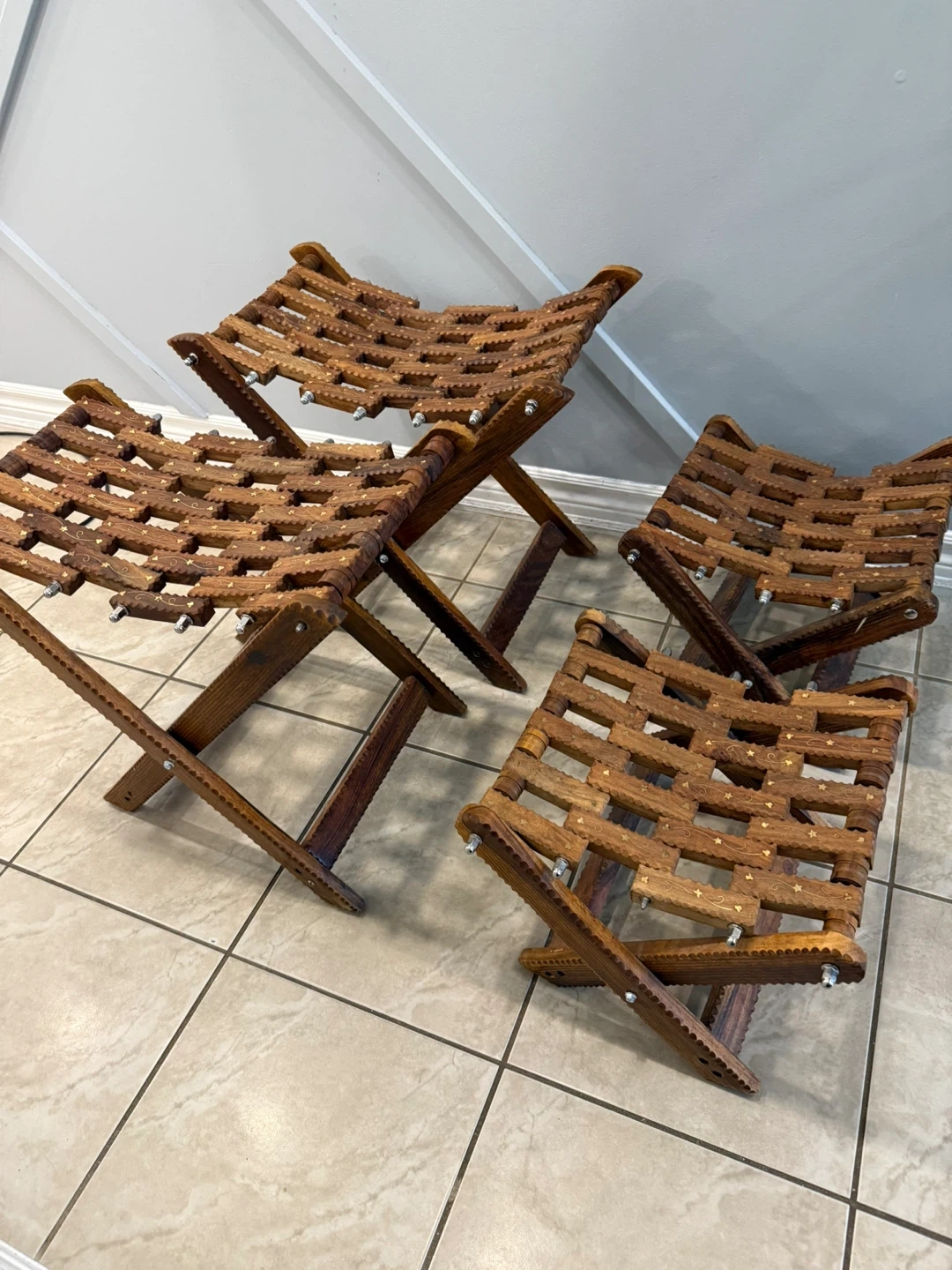 Selling a set of folding wooden stools. They're great for extra seating or as a decorative piece. The stools are handmade wood and have a unique woven design. They are lightweight and easy to move around