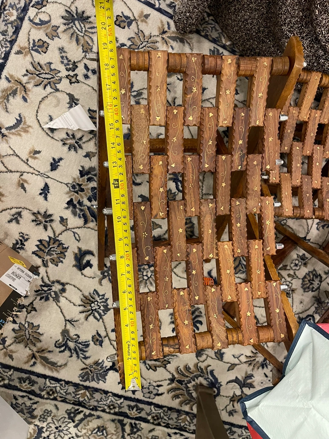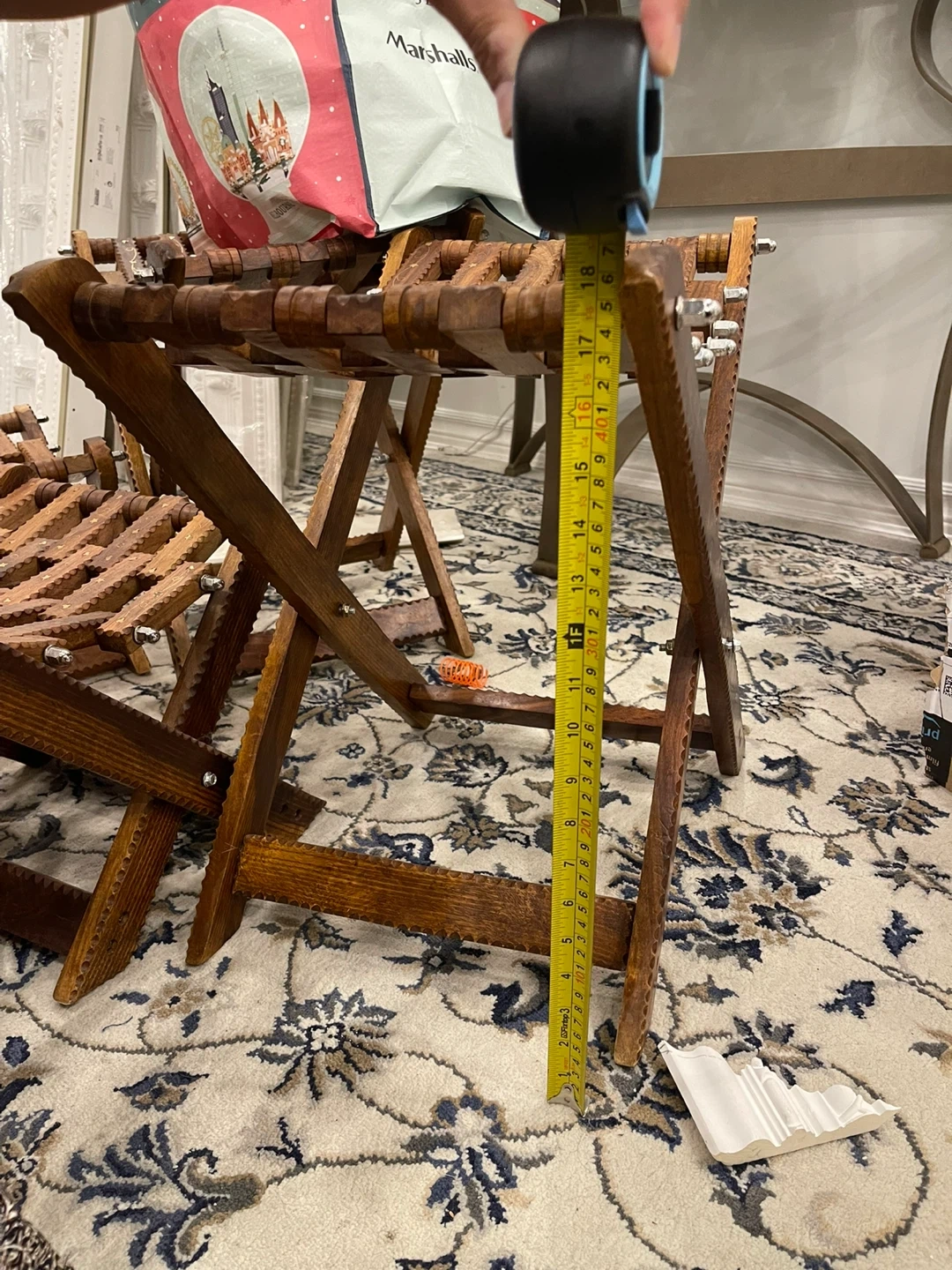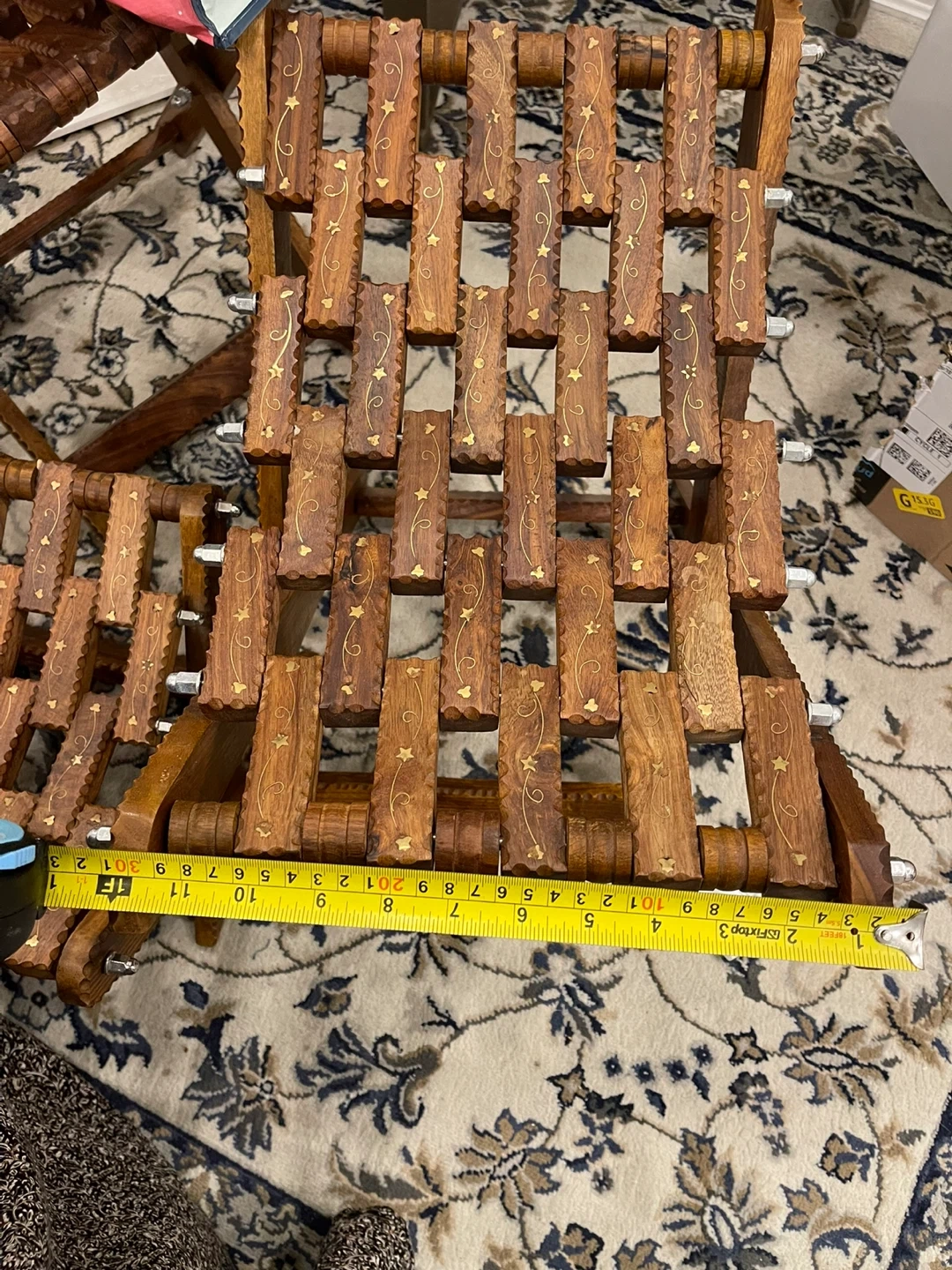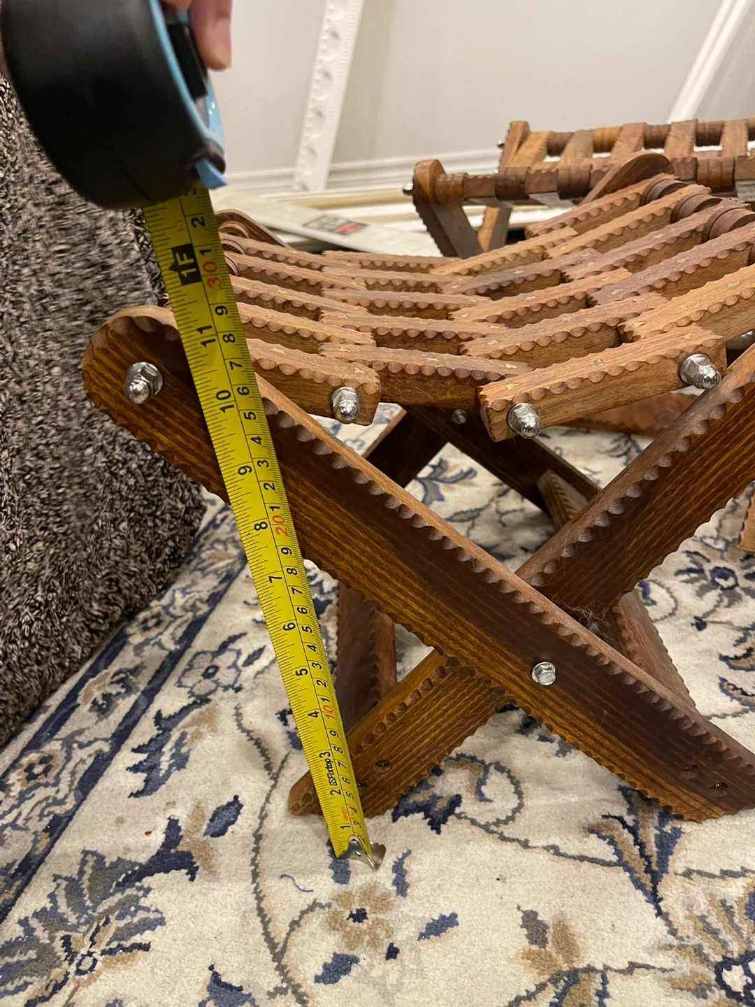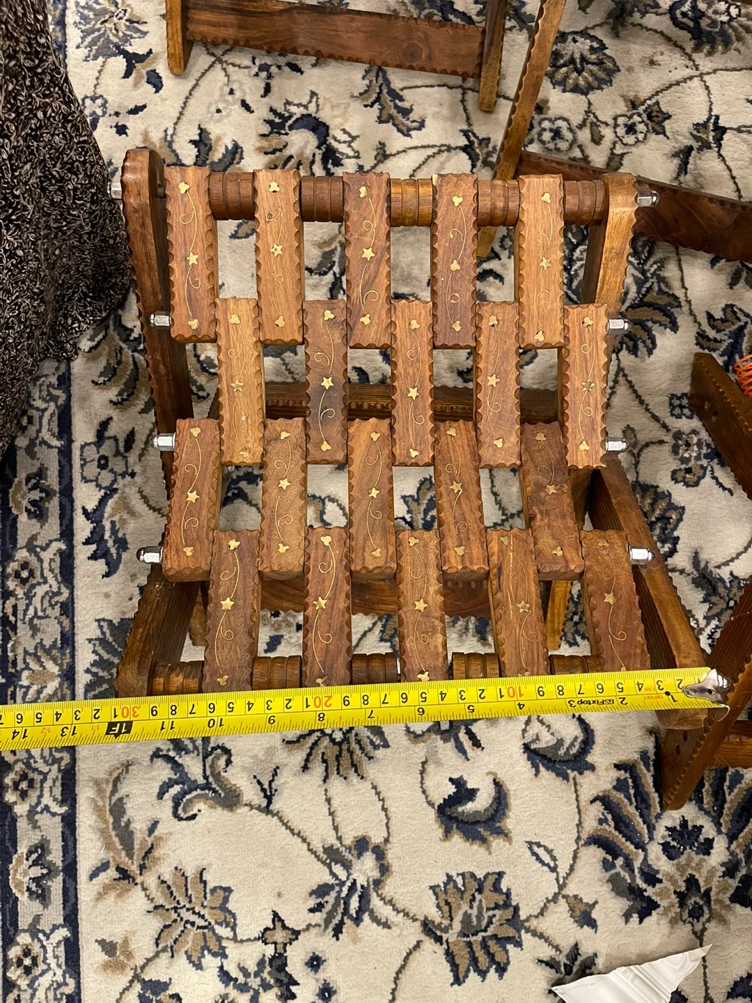 Selling a set of folding wooden stools. They're great for extra seating or as a decorative piece. The stools are handmade wood and have a unique woven design. They are lightweight and easy to move around