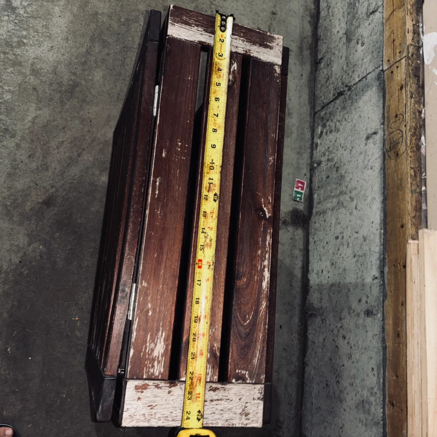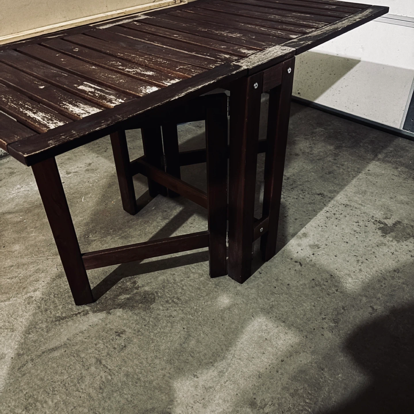Selling a folding wooden table. It's great for small spaces and easy to store when not in use. The table has a rustic look with a dark brown finish. It's sturdy and functional, perfect for a variety of uses