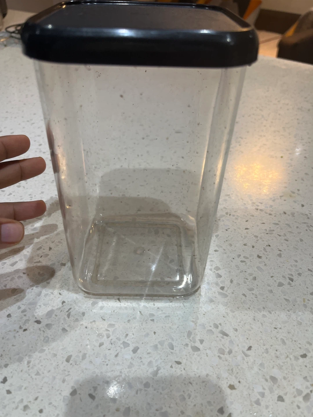 Selling a food storage container with a black lid. It's in good condition and ready to keep your pantry organized