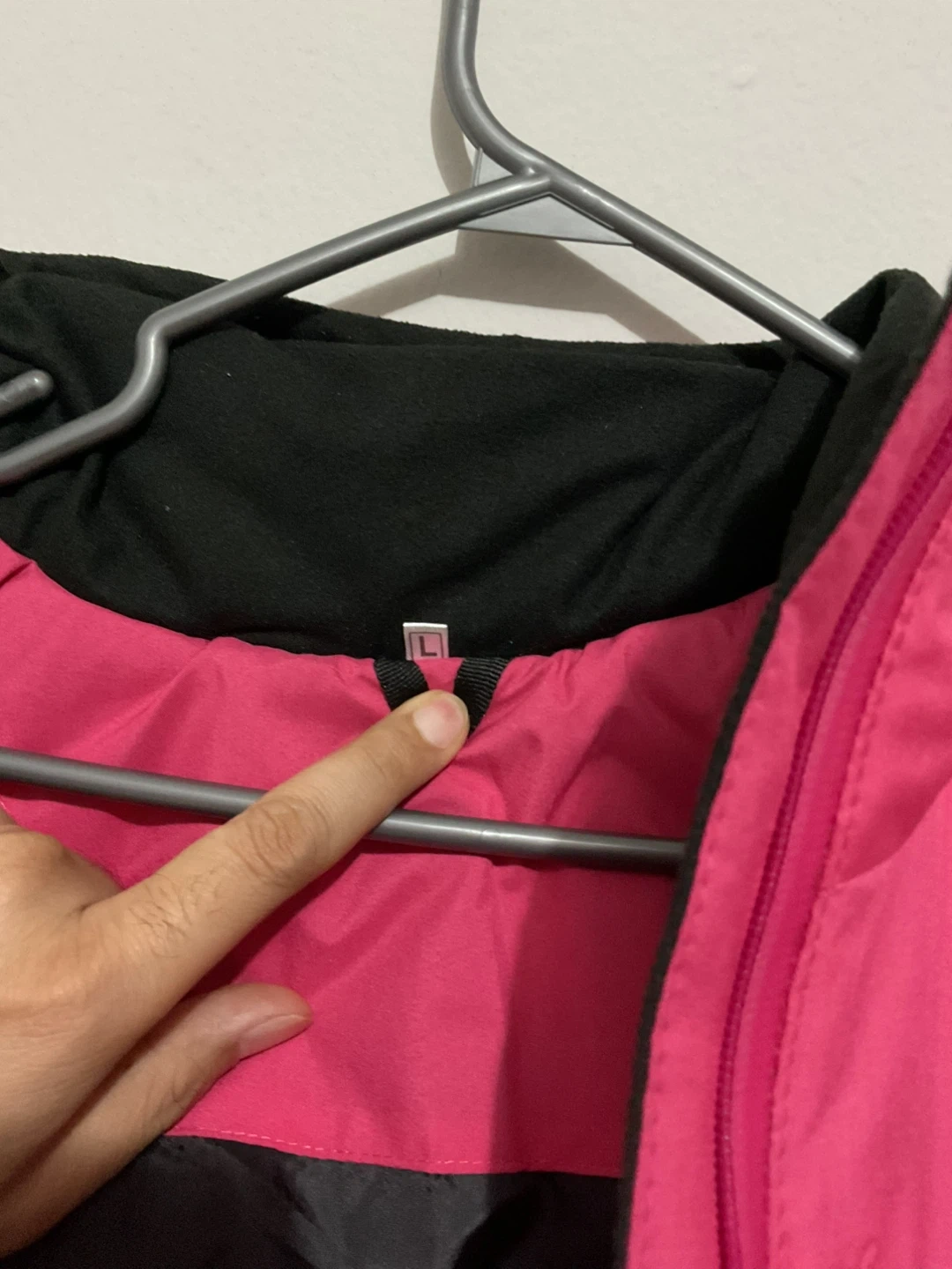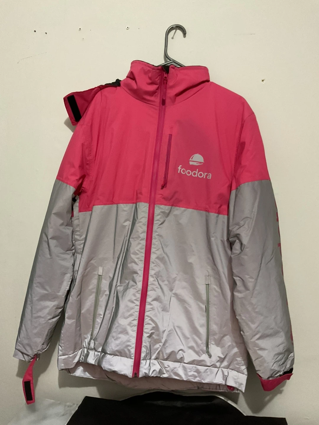 Selling a Foodora jacket in pink and grey, size large. It's in great condition and perfect for staying warm and visible!