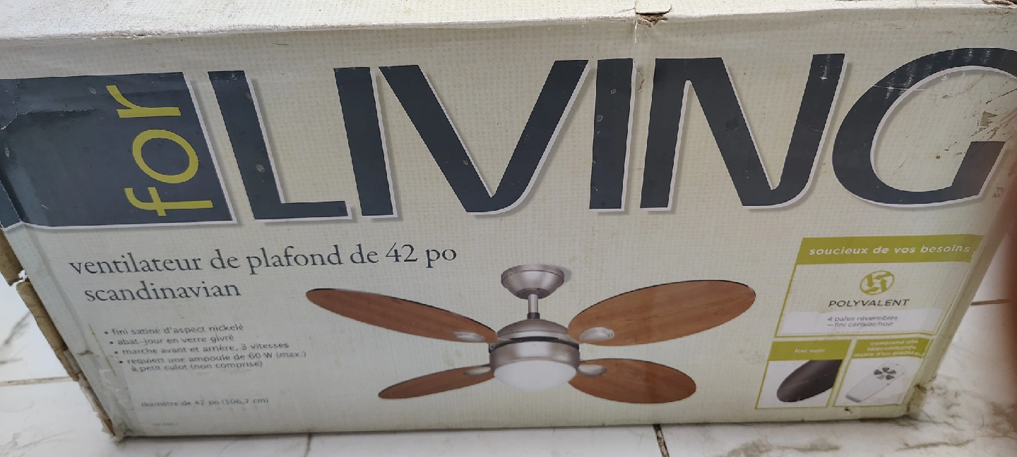 Selling a For Living Scandinavian ceiling fan with a 42-inch diameter. It features a satin nickel finish and a frosted glass shade. It has a forward and reverse function with 3 speeds. The box says it requires a 60W bulb (not included).