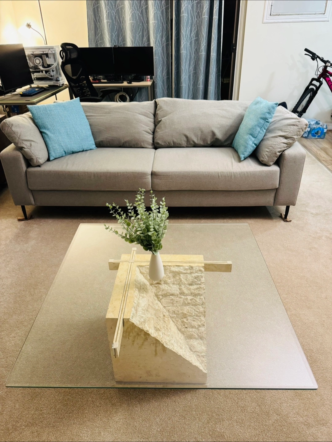 ✨ Details: • Size: 36” x 36” • Height: 15” • Features a thick glass top supported by a striking stone base with a natural textured finish. • Sturdy, stylish, and a perfect centerpiece for your living room. 🛋️ Condition: Gently used, excellent condition. 💲 Price: Slightly Negotiable 📍 Pickup only If interested, please message me!