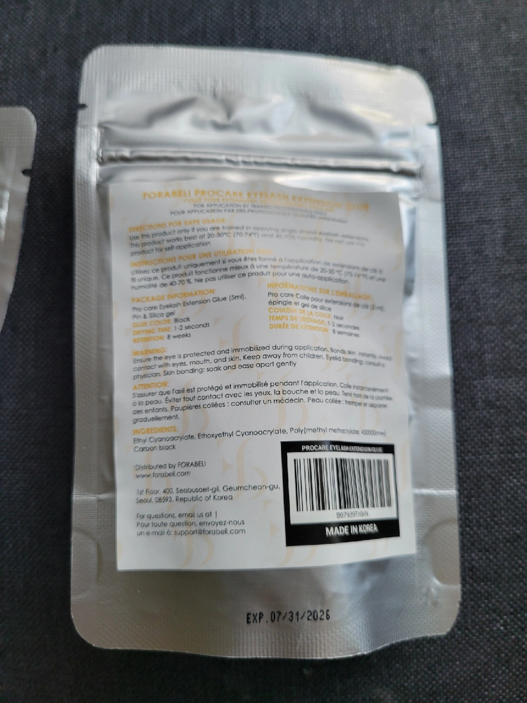 I have two Forabeli Pro Care Eyelash Extension Glue packets for sale! Each packet contains 5mL/0.17 FL.OZ of glue. The glue is designed for application by trained professionals. Expiry date: July 31, 2026 Pick up lower Stoney Creek