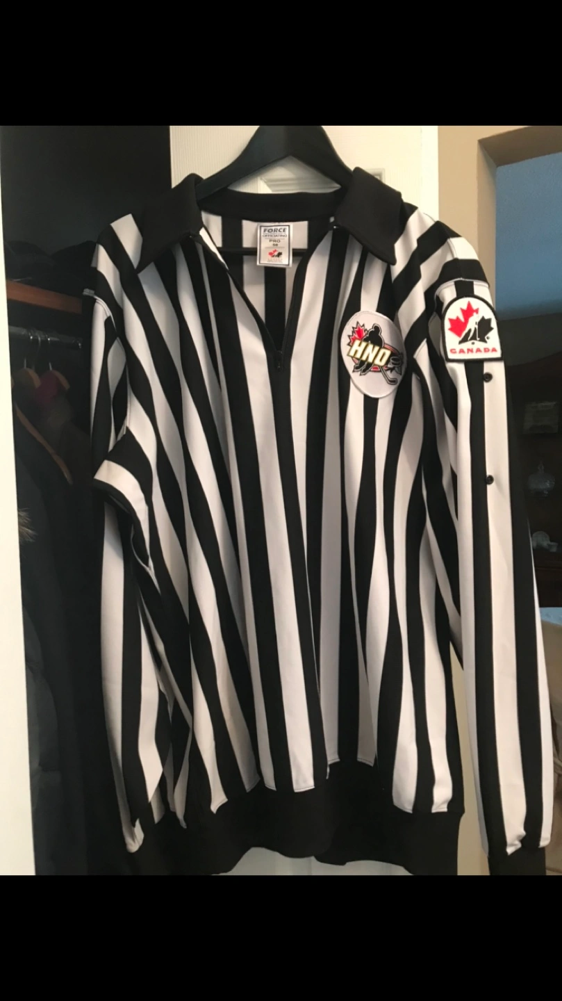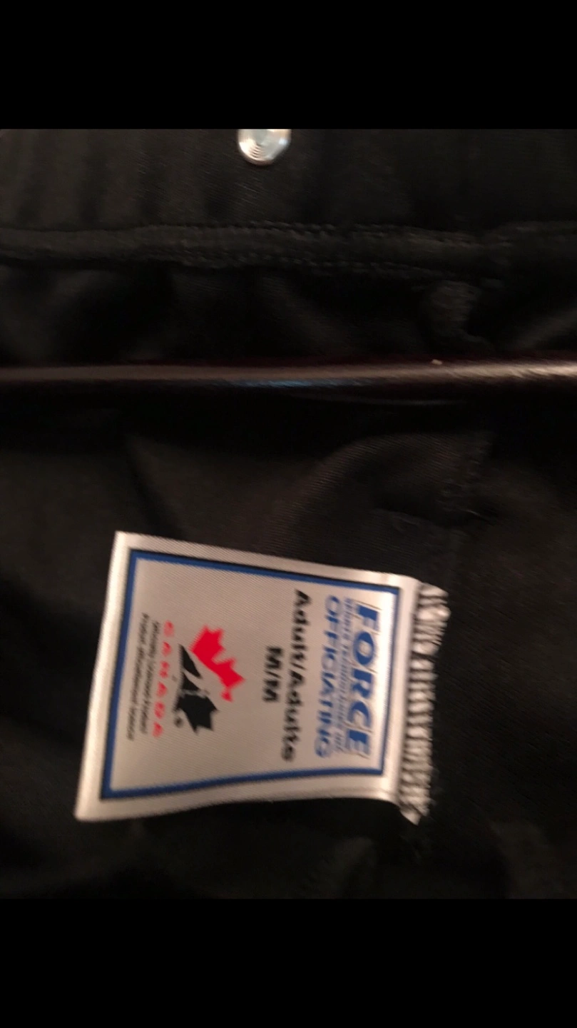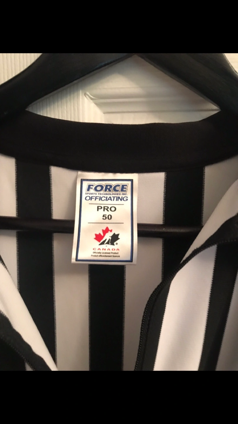 Selling a Force Officiating referee jersey and pants. The size is Adult/Adults M/M. The jersey is black and white striped with Canada flag patch. Perfect for hockey games or costume!