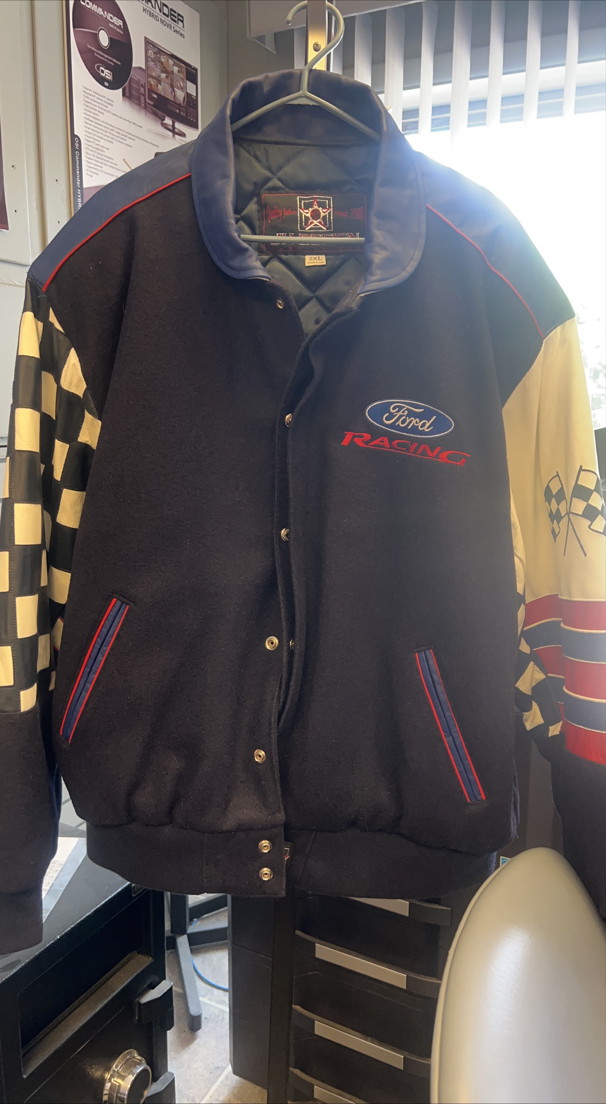 Ford Racing jacket in size 2XL. It features the Ford Racing logo and checkered flag design on the sleeves. The jacket is in good condition and ready for a new home!
