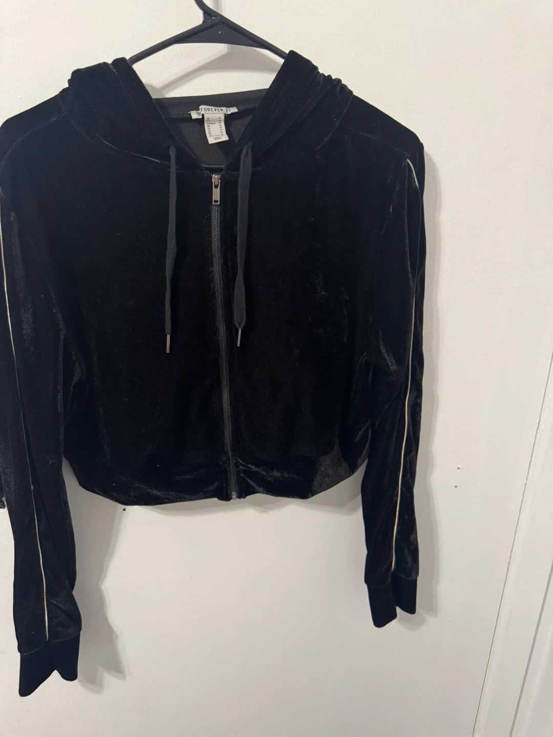 Cozy black velvet zip-up hoodie from Forever 21! It's a size small and in great condition. Perfect for layering or just lounging around the house. The stripe down the sleeves adds a nice touch! I just dont wear cropped hoodies anymore but this is one of my favorite hoodies ive ever had :( If you’re seeing this it’s still available, feel free to chat while it’s still here. First come first served.