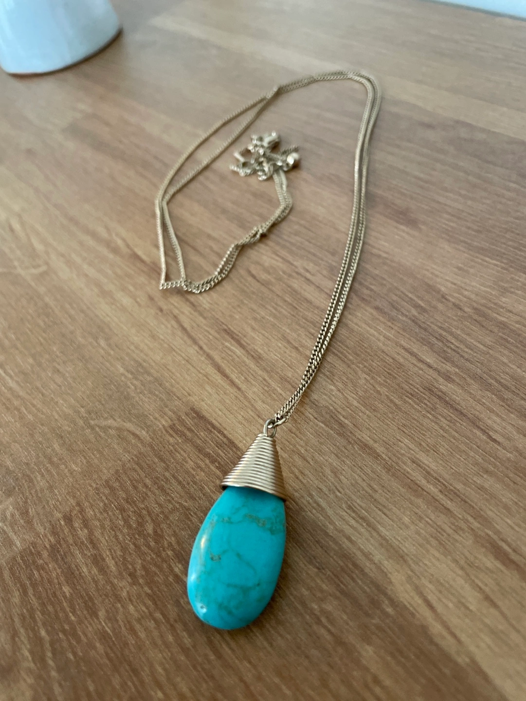 Long gold chain necklace. Features a teardrop turquoise pendant. Beautiful statement piece. Perfect for layering.