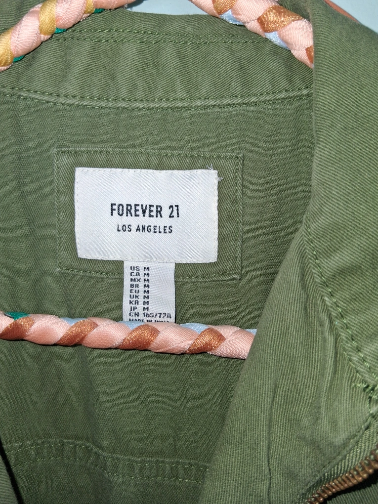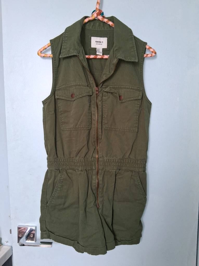 Selling a Forever 21 romper in an olive green colour! It's a size medium and in great condition. Perfect for a casual day out or a summer adventure. It has a collared neck and a zip-up front.