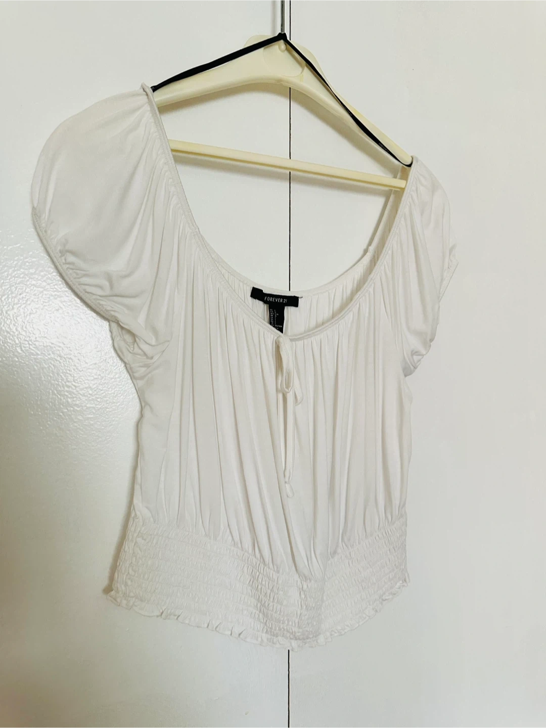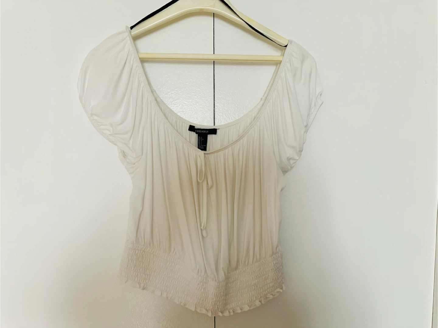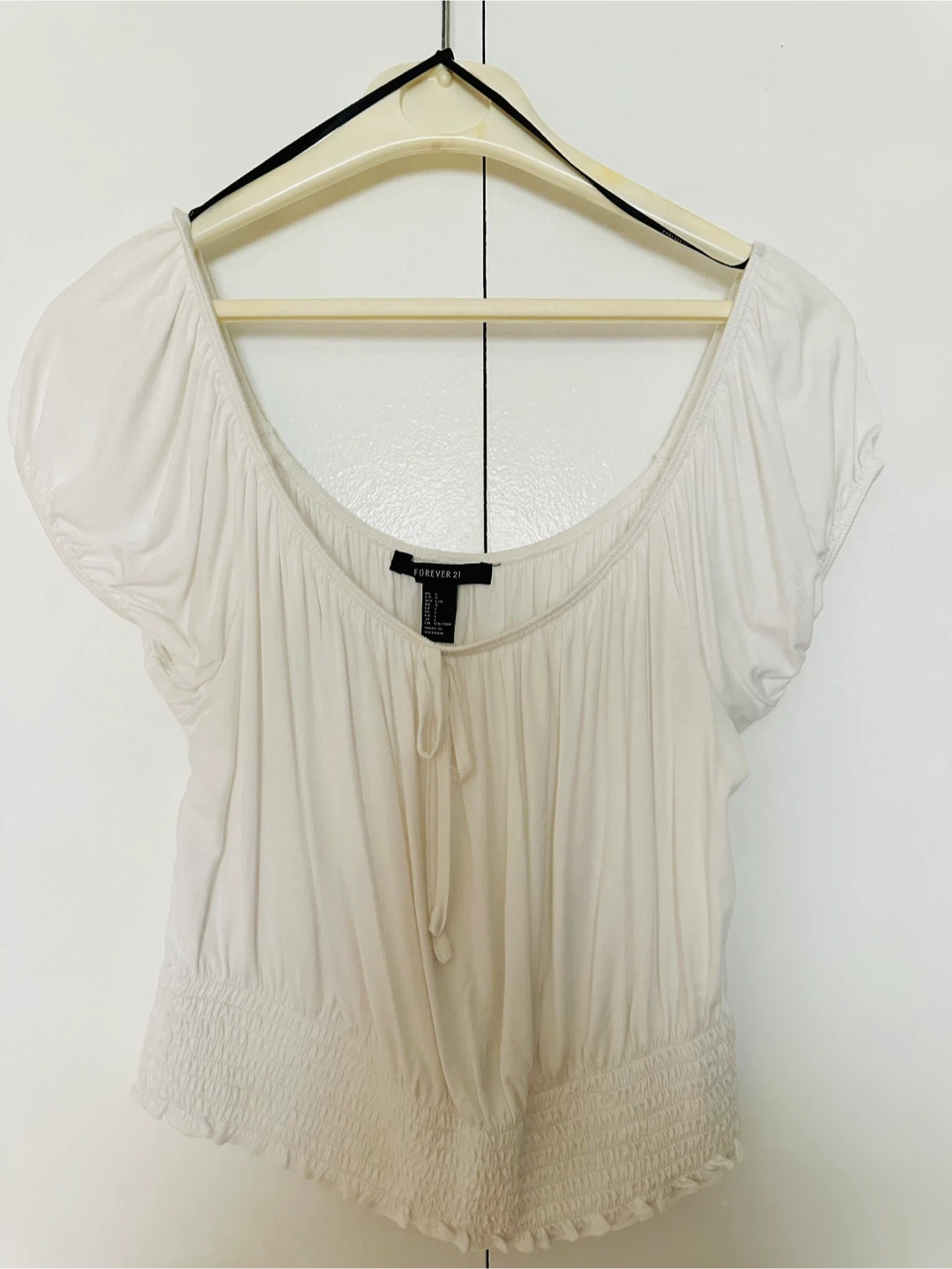 Selling a cute white top from Forever 21! It's a size large and in great condition. The material is soft and comfy, perfect for a casual day out or dressing up for a night out