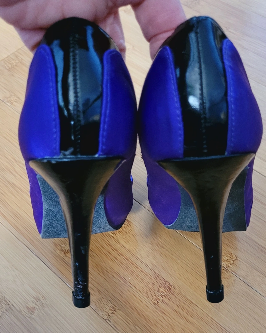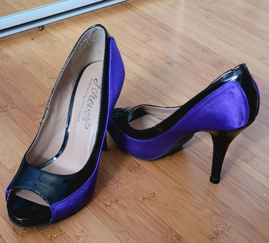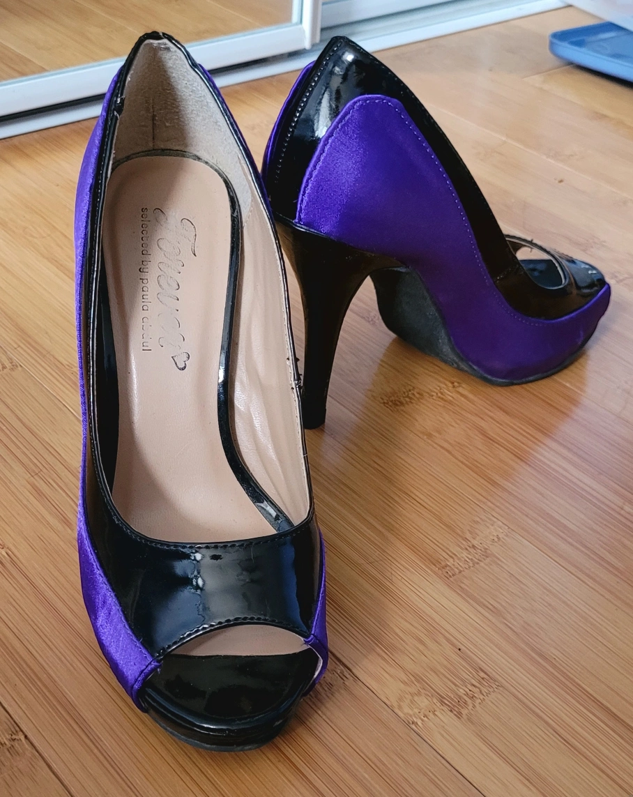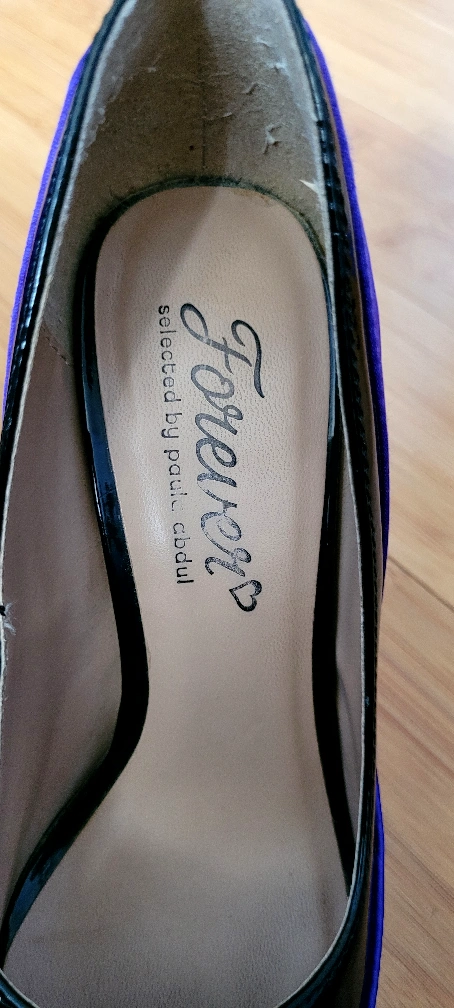 Cute Forever Paula Abdul heels in a size 6. These are a stylish purple and black patin colour. They're in good condition and ready for a new home! These are gorgeous shoes!!