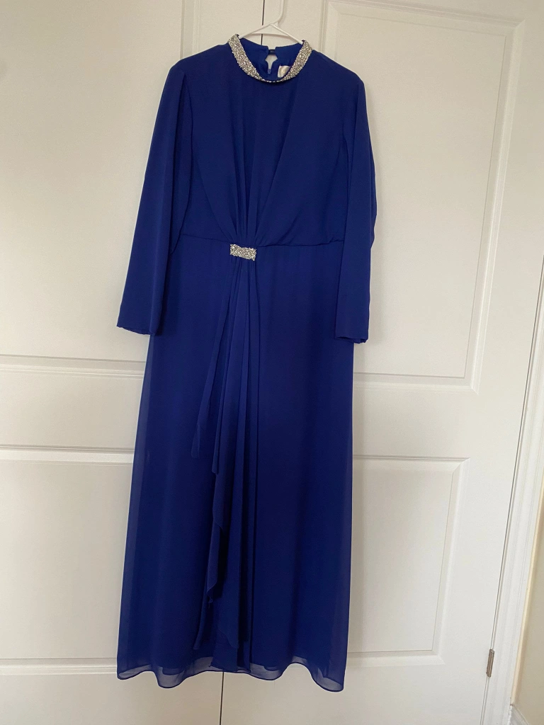 Elegant blue dress, perfect for a special occasion. Long sleeves. Embellishments around the neckline. Decorative details on the front. Consider wearing it to a dinner party.