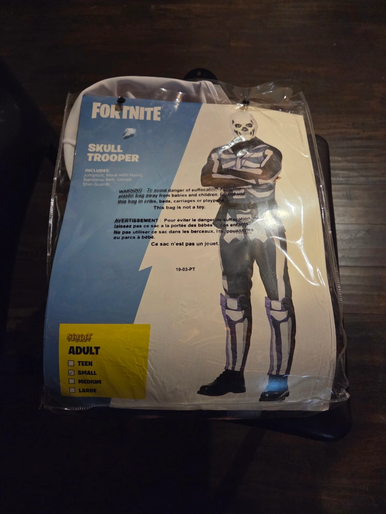 Show allSelling a Fortnite Skull Trooper costume for adults! Includes the jumpsuit, mask with hood, belt, and shin guards. Size is adult small.