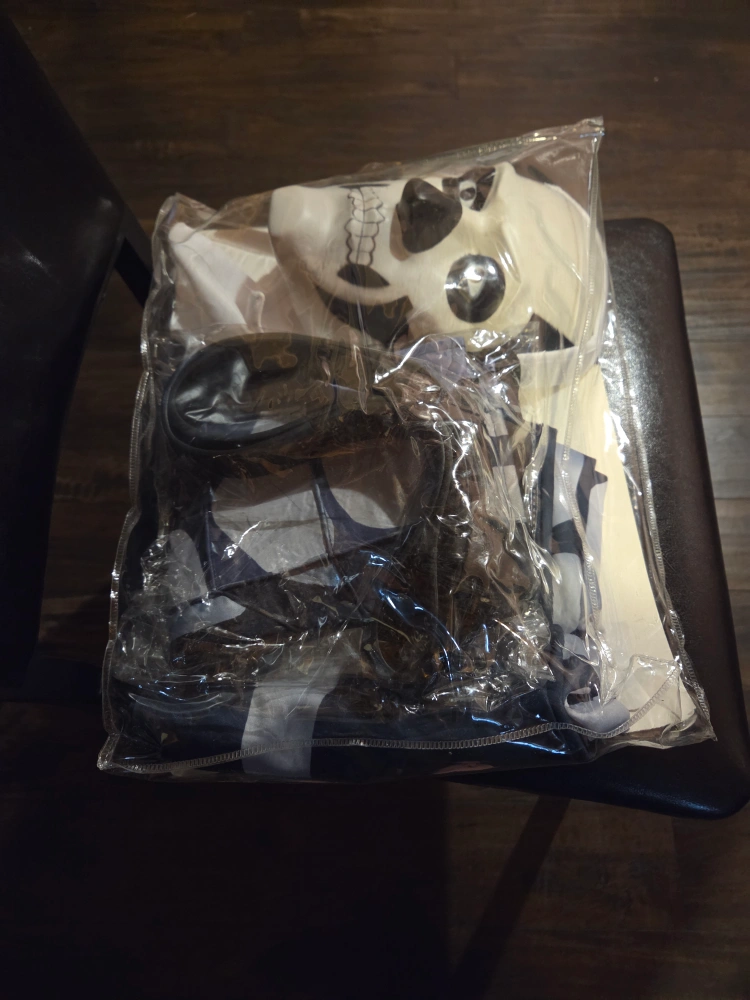 Selling a Fortnite Skull Trooper costume for adults! Includes the jumpsuit, mask with hood, belt, and shin guards. Size is adult small.