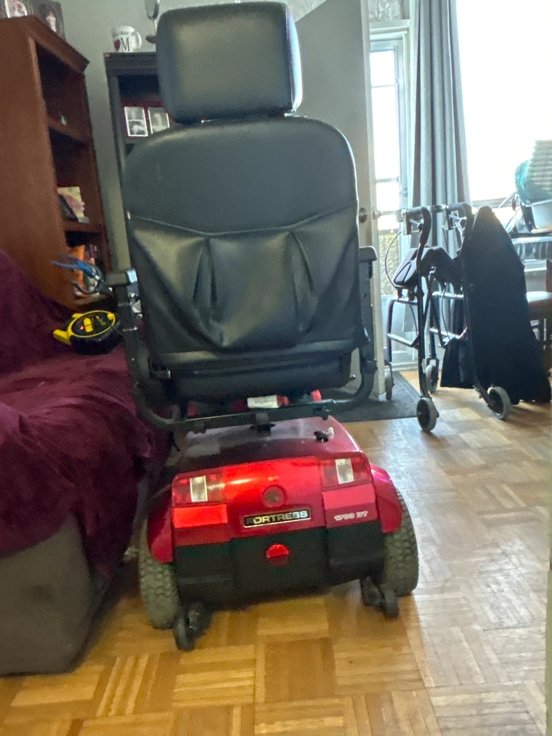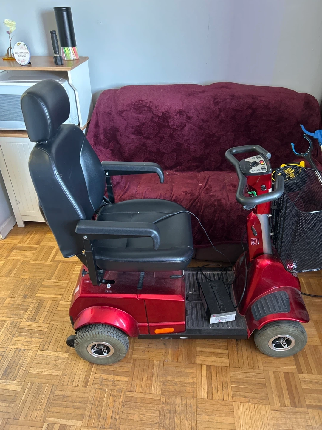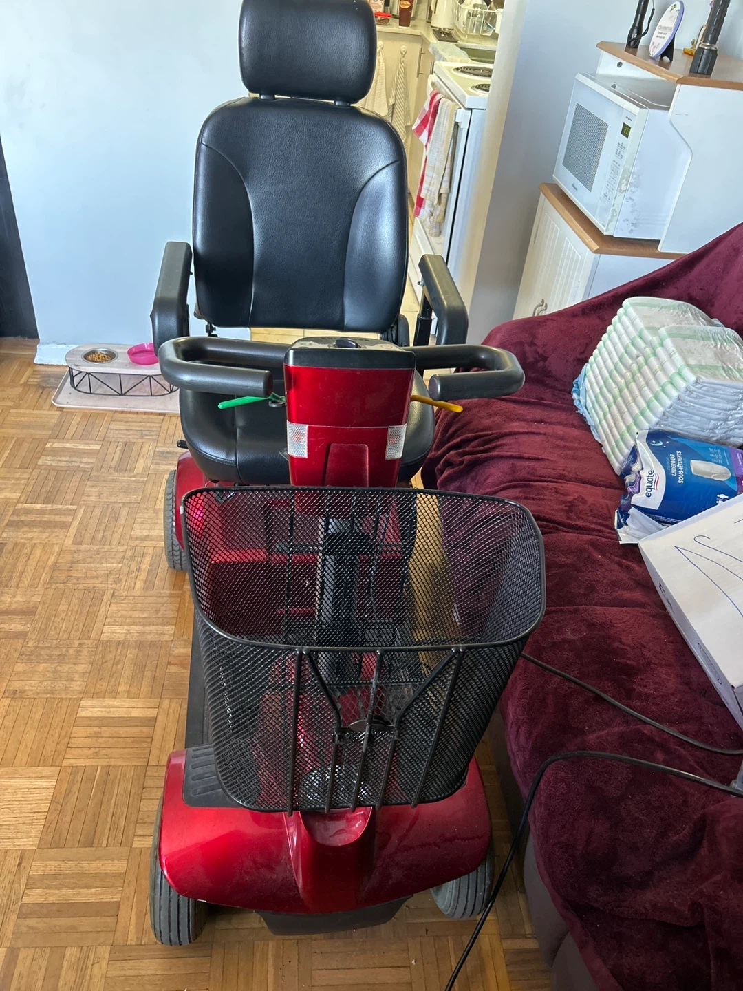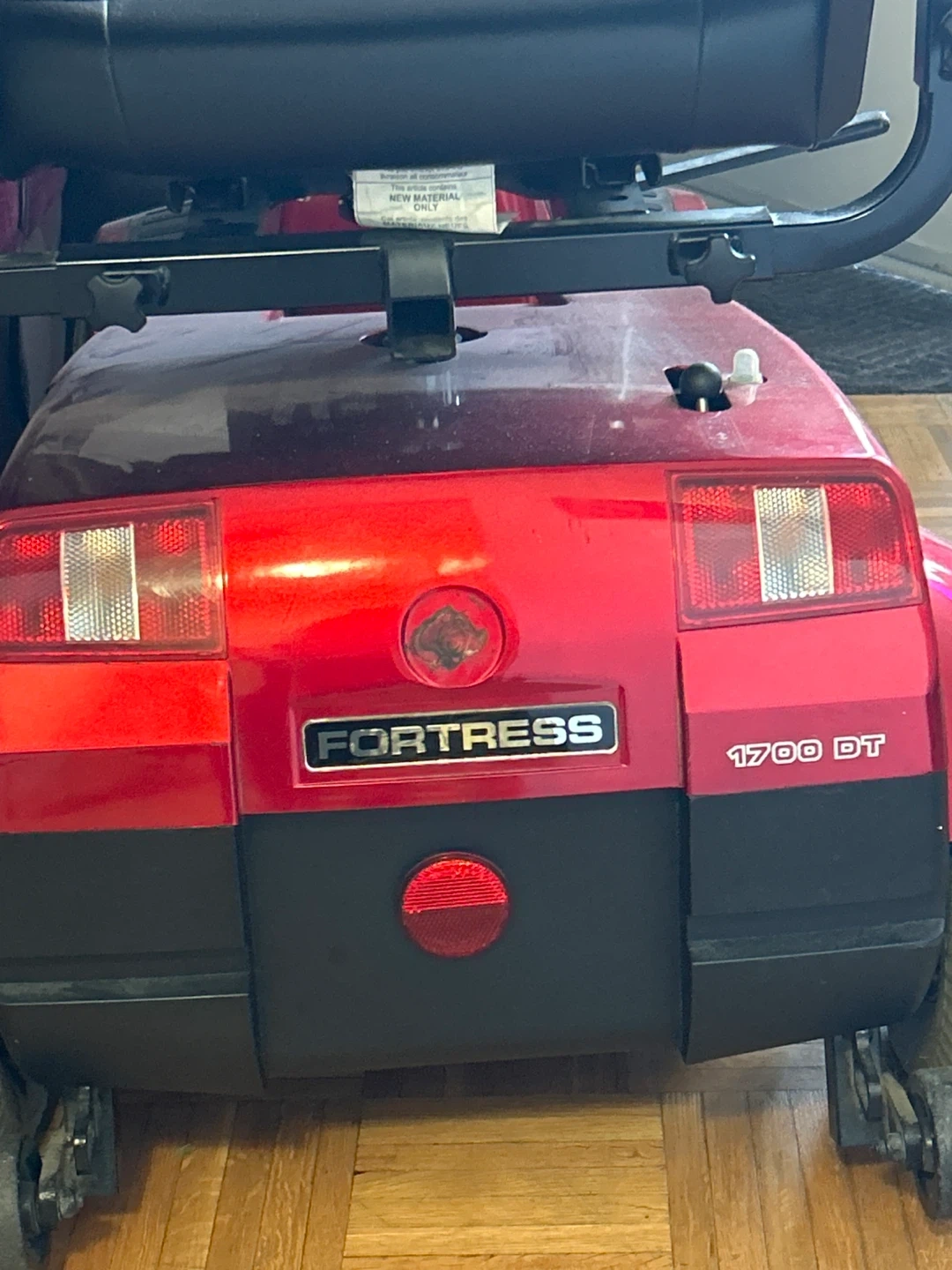 Selling a Fortress 1700 DT mobility scooter in good condition. It's red and black with a comfortable seat and a basket in the front. Great for getting around!