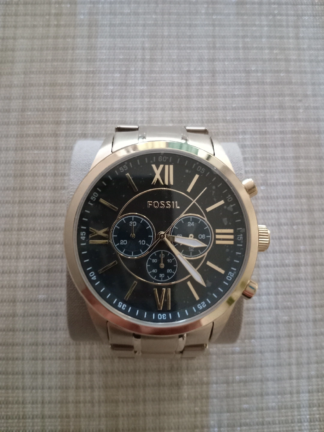 Selling a Fossil gold chronograph watch. It has a black face with gold accents and a stainless steel band. The watch features chronograph subdials and Roman numeral hour markers. It's in great condition and ready for a new home