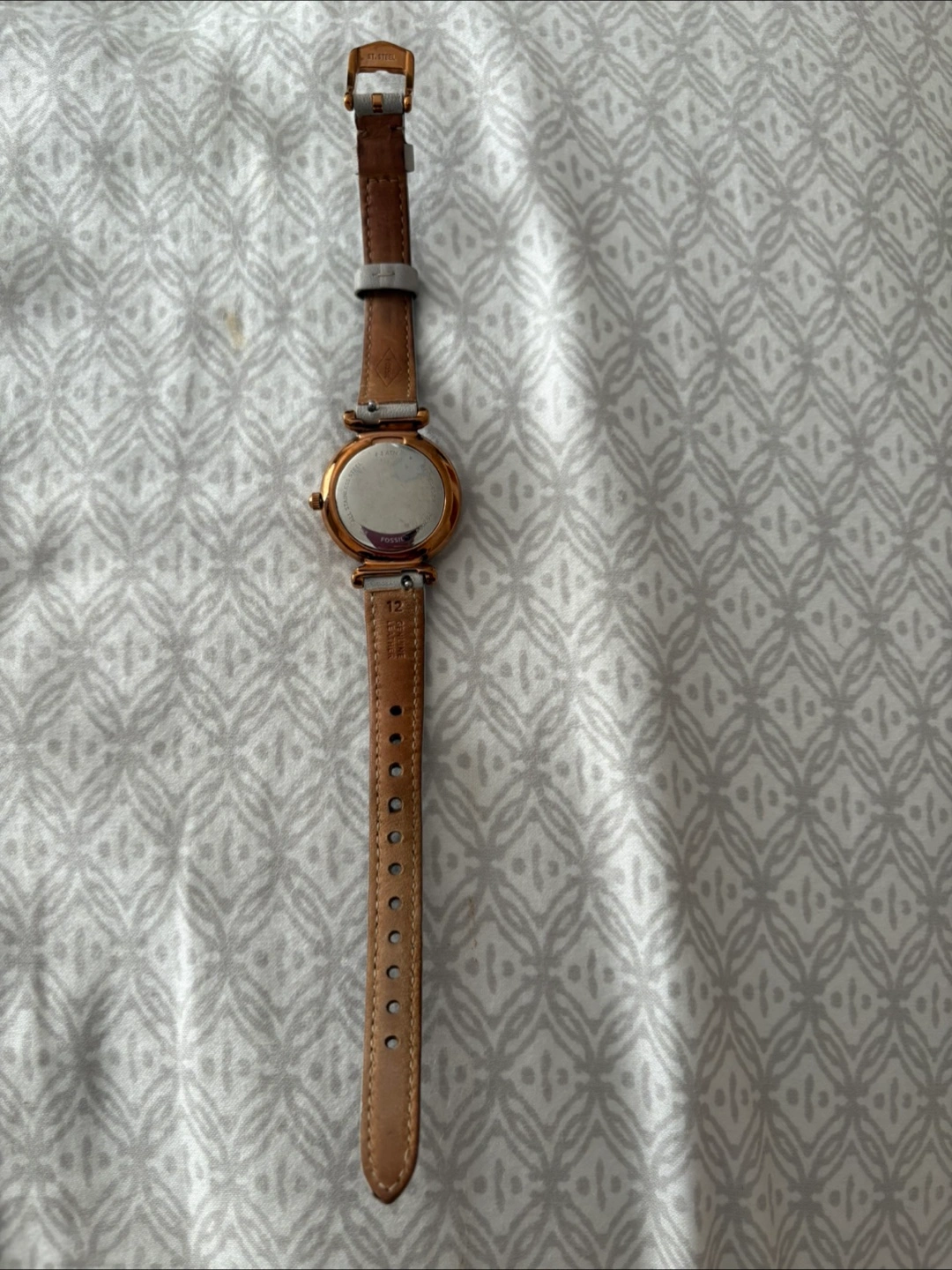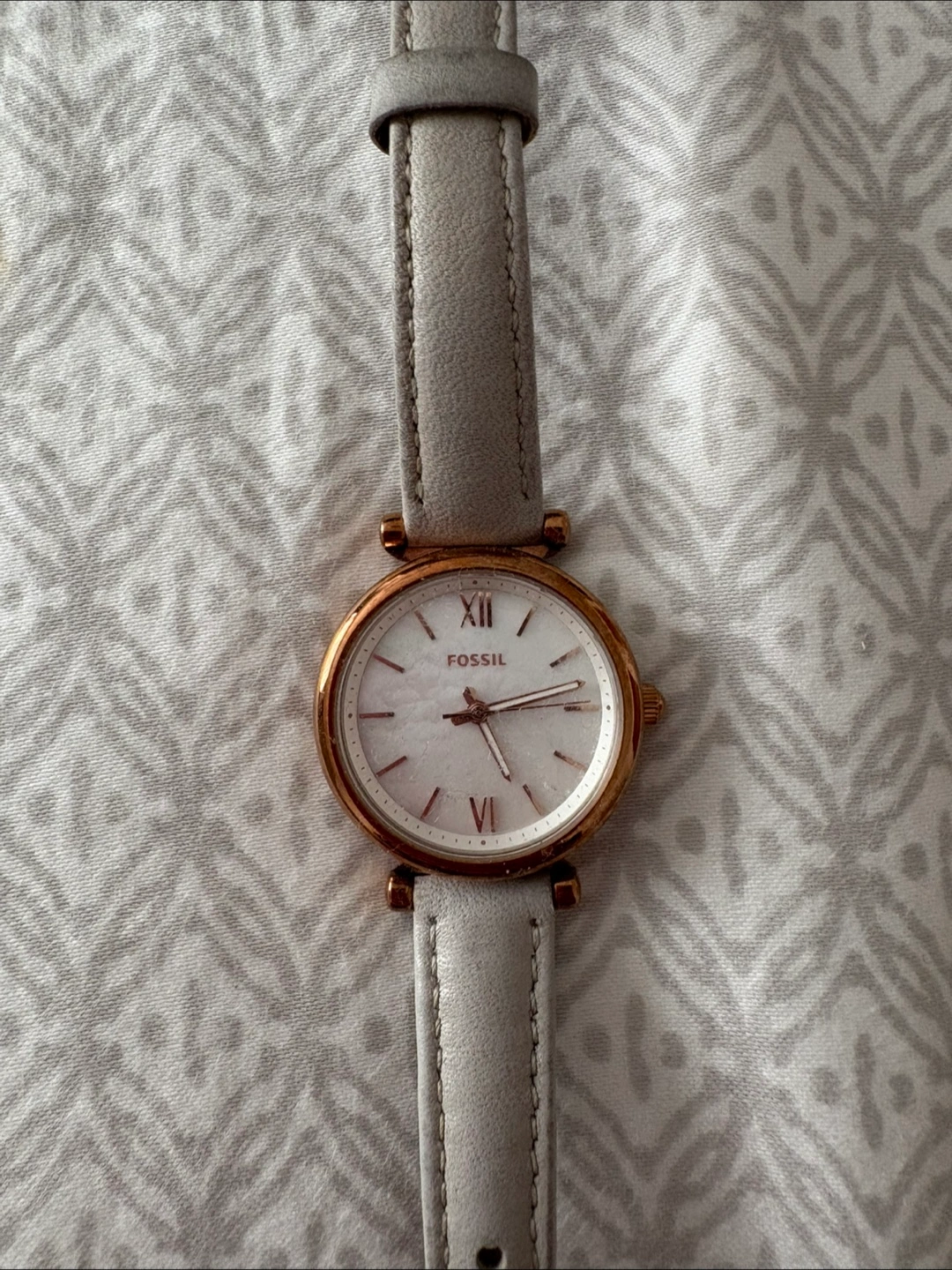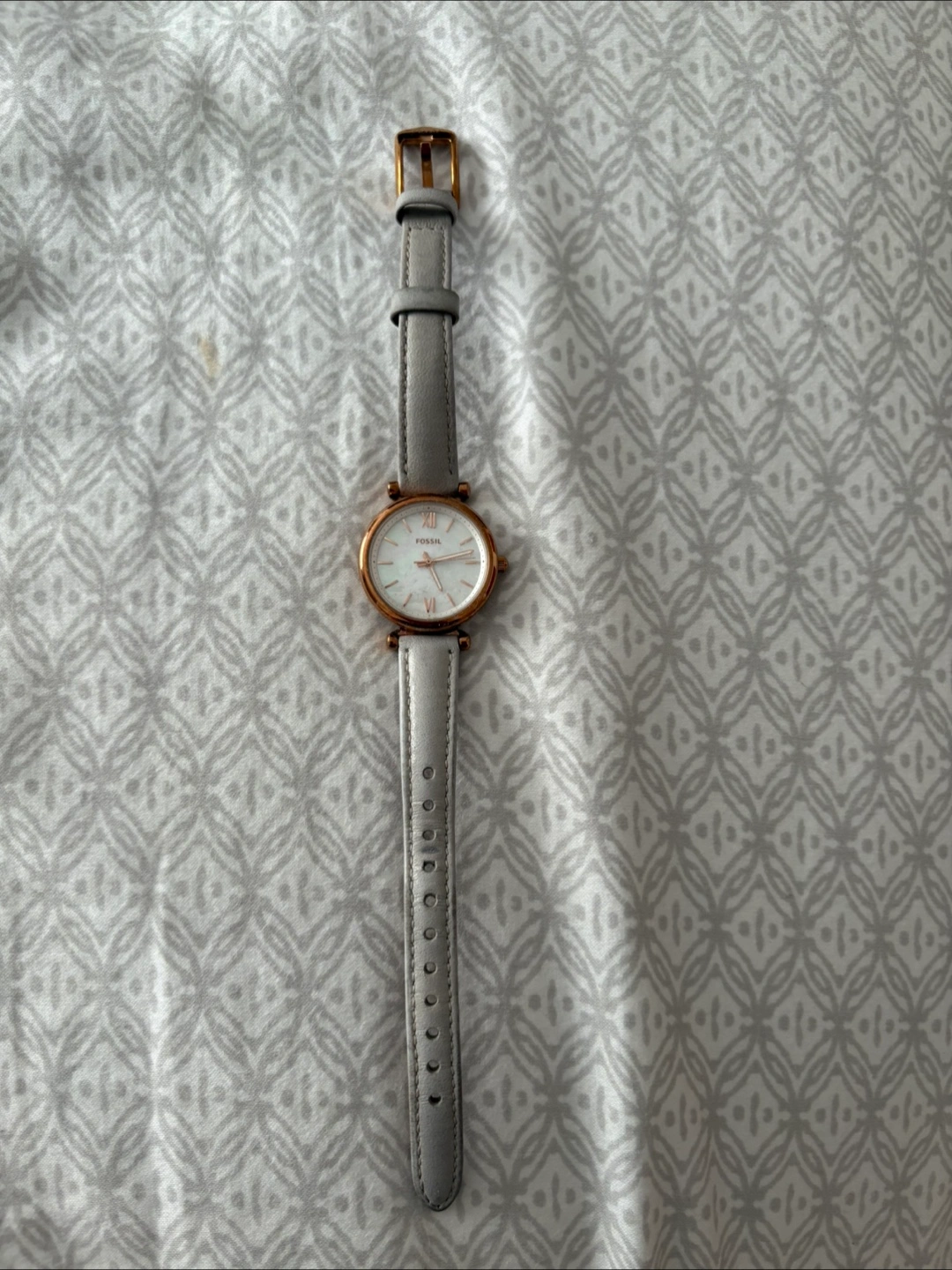 Selling a Fossil ladies' watch with a grey leather band and a rose gold-tone case. It's in great condition and ready for a new wrist!