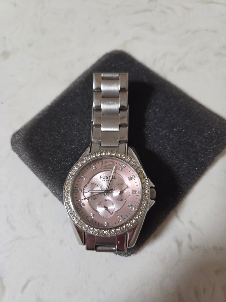 Selling a Fossil Stella watch! It comes with its original box. The watch has a silver band and a pink face, surrounded by rhinestones. Originally bought for $225