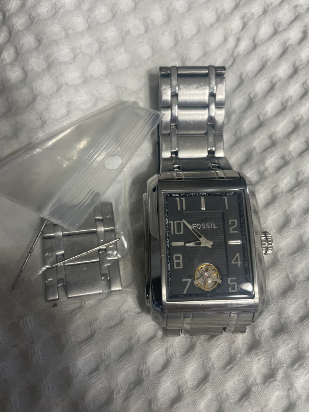 Selling a Fossil watch in silver. It has a rectangular face with a black dial and silver numbers. Includes extra links to adjust the size