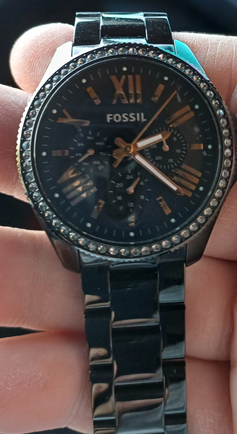 Selling a Fossil women's watch with a black stainless steel band. It features a black dial with gold-tone Roman numeral markers and crystal accents around the bezel. The watch has a chronograph display. It's in great condition! needs a battery