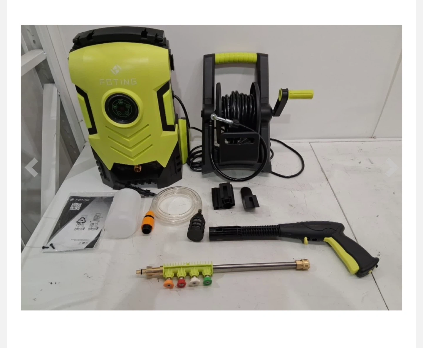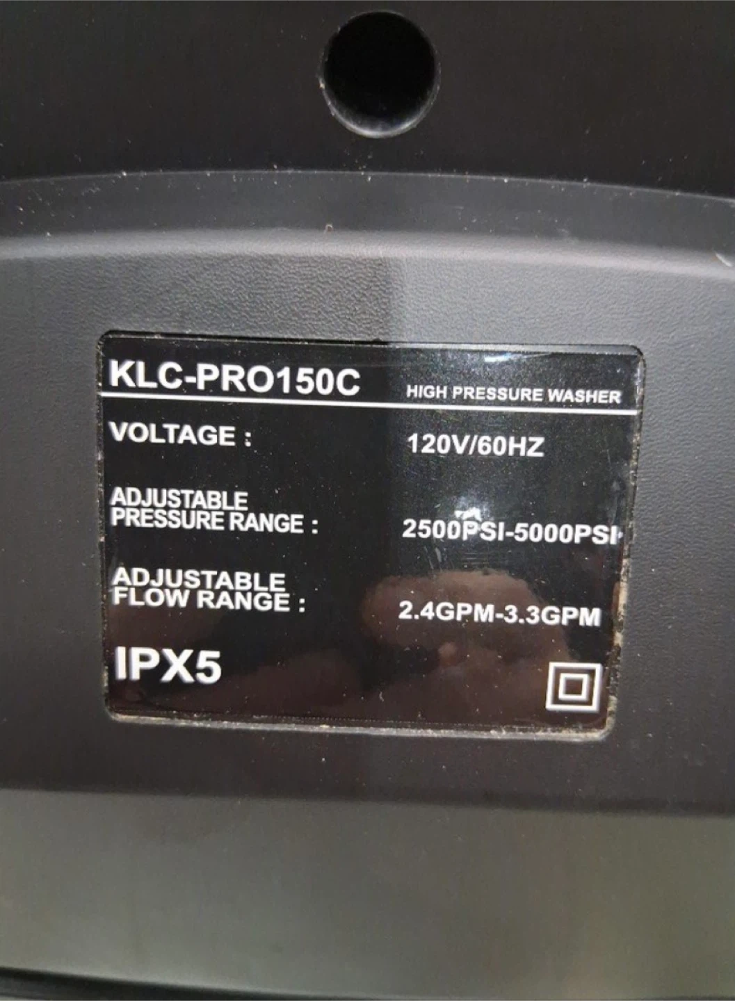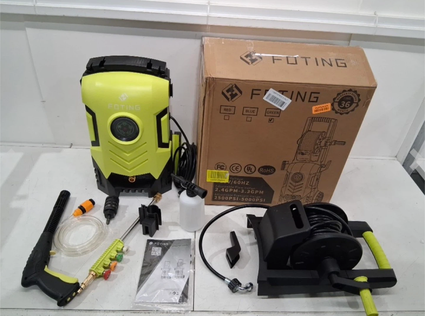 Selling a FOTING high-pressure washer, model KLC-PRO150C. It features an adjustable pressure range of 2500PSI-5000PSI and an adjustable flow rate of 2.4GPM-3.3GPM. It operates at 120V/60HZ. The box and all included components are included!