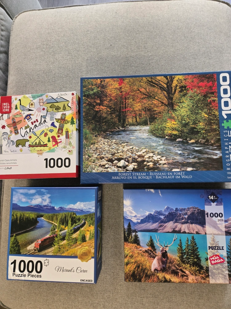 Selling a set of four 1000-piece puzzles! Includes a Canada-themed puzzle by Belvedere/Trefl, a Forest Stream puzzle by Eurographics, a Morant's Curve puzzle, and a Hua Dada puzzle. All are in great shape and ready for a new home