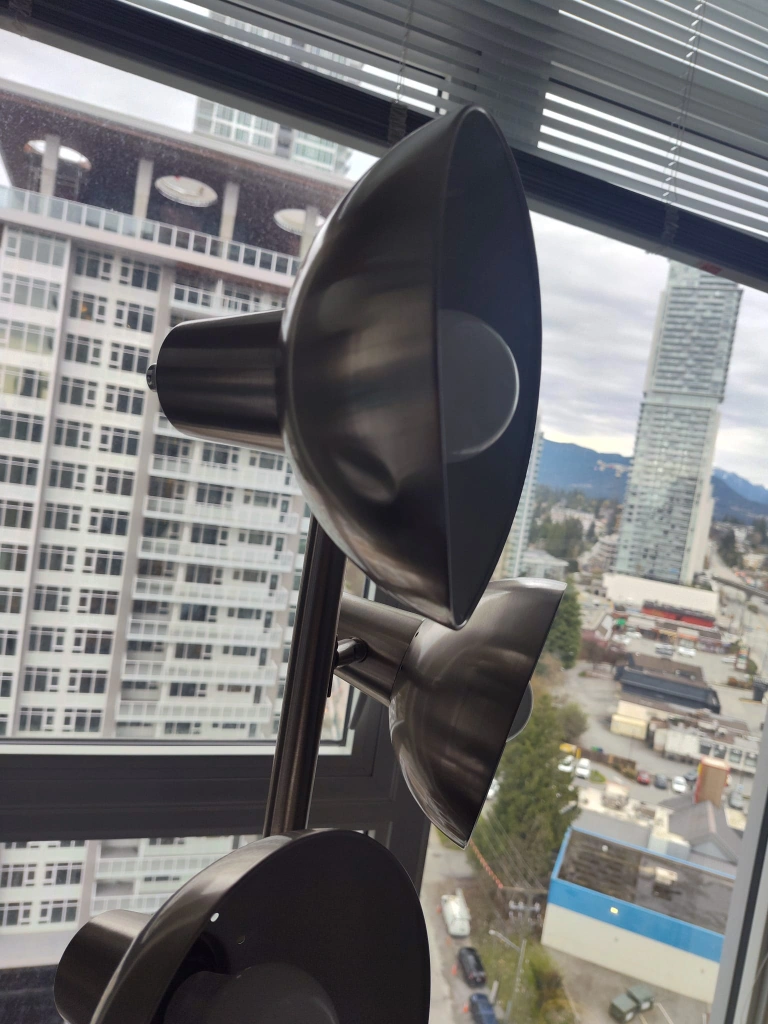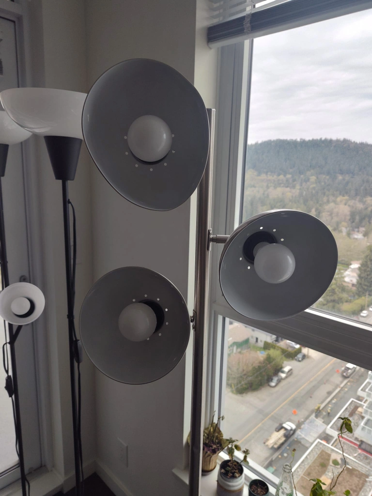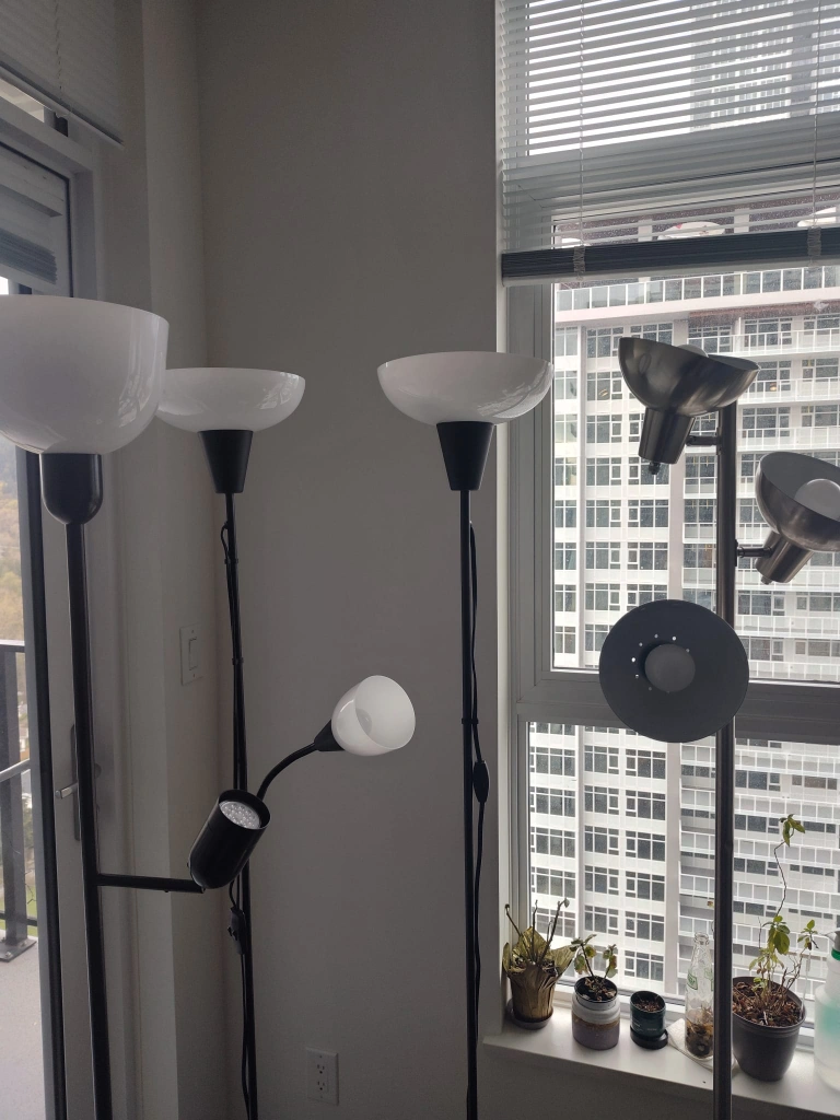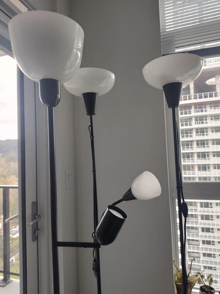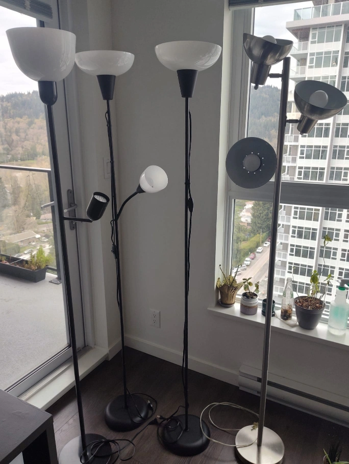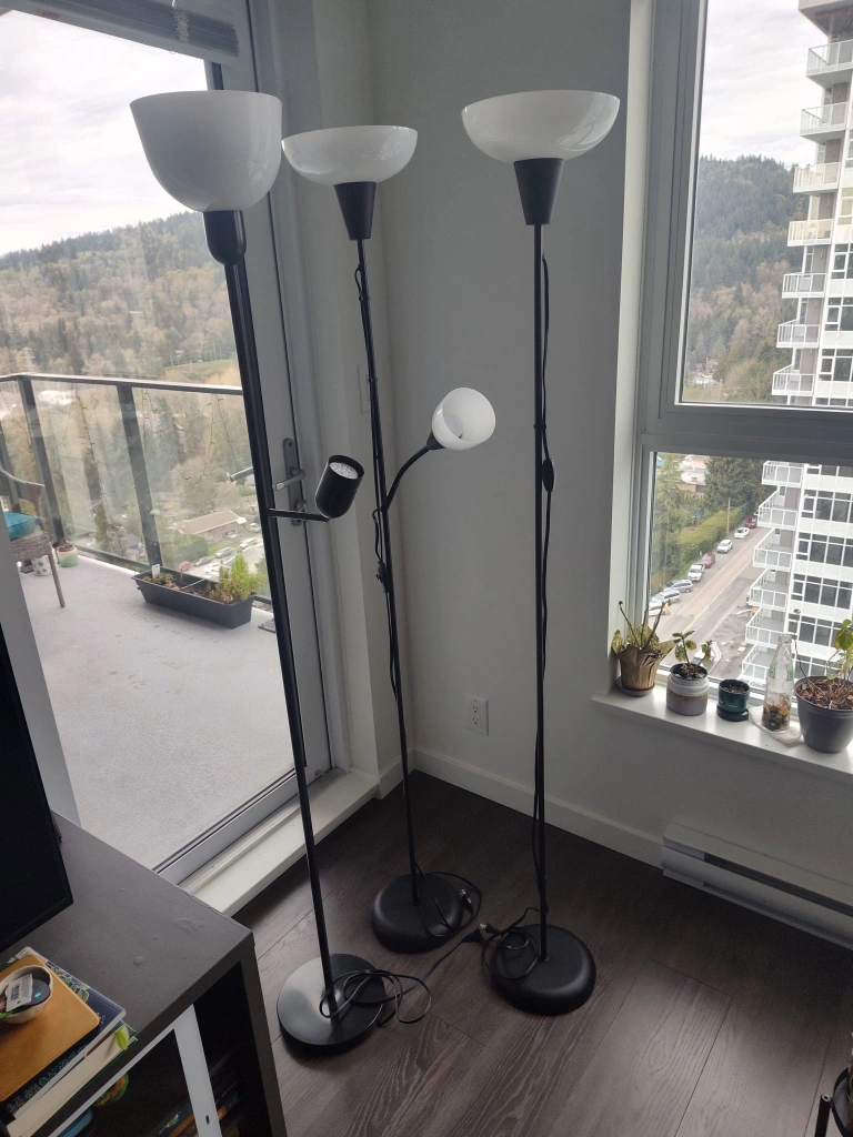 Selection of four floor lamps. Three IKEA black floor lamps with white shades, one features an adjustable spotlight. One silver floor lamp with three grey shades. The heads of the grey lamp are not fully round anymore. All lamps are pre-owned. 10 $ for each black floor lamp 15$ for grey floor lamp Pickup only at Burquitlam.