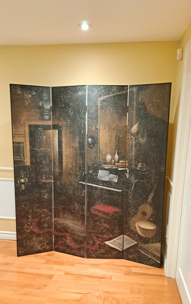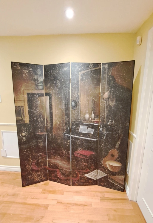 H 72" × Total W 64", each panel W 16". Four panel room divider screen. Features a unique, vintage style design.