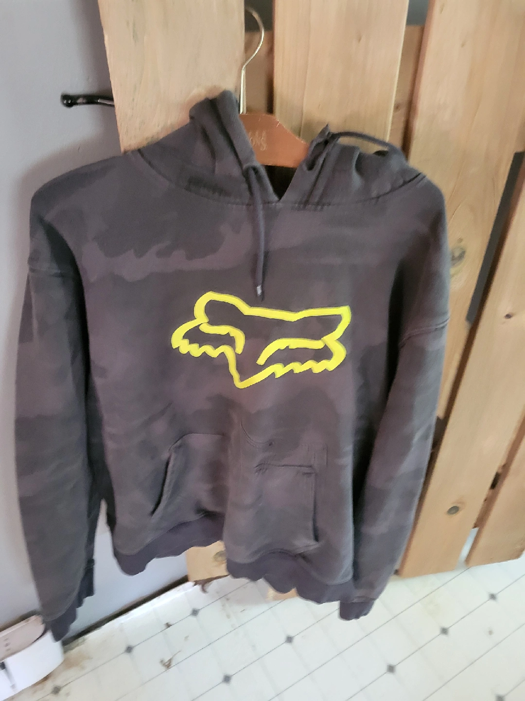 Selling a Fox Racing hoodie with a cool camo pattern! The hoodie features the classic Fox logo in yellow on the front. It's in great condition and ready for a new home