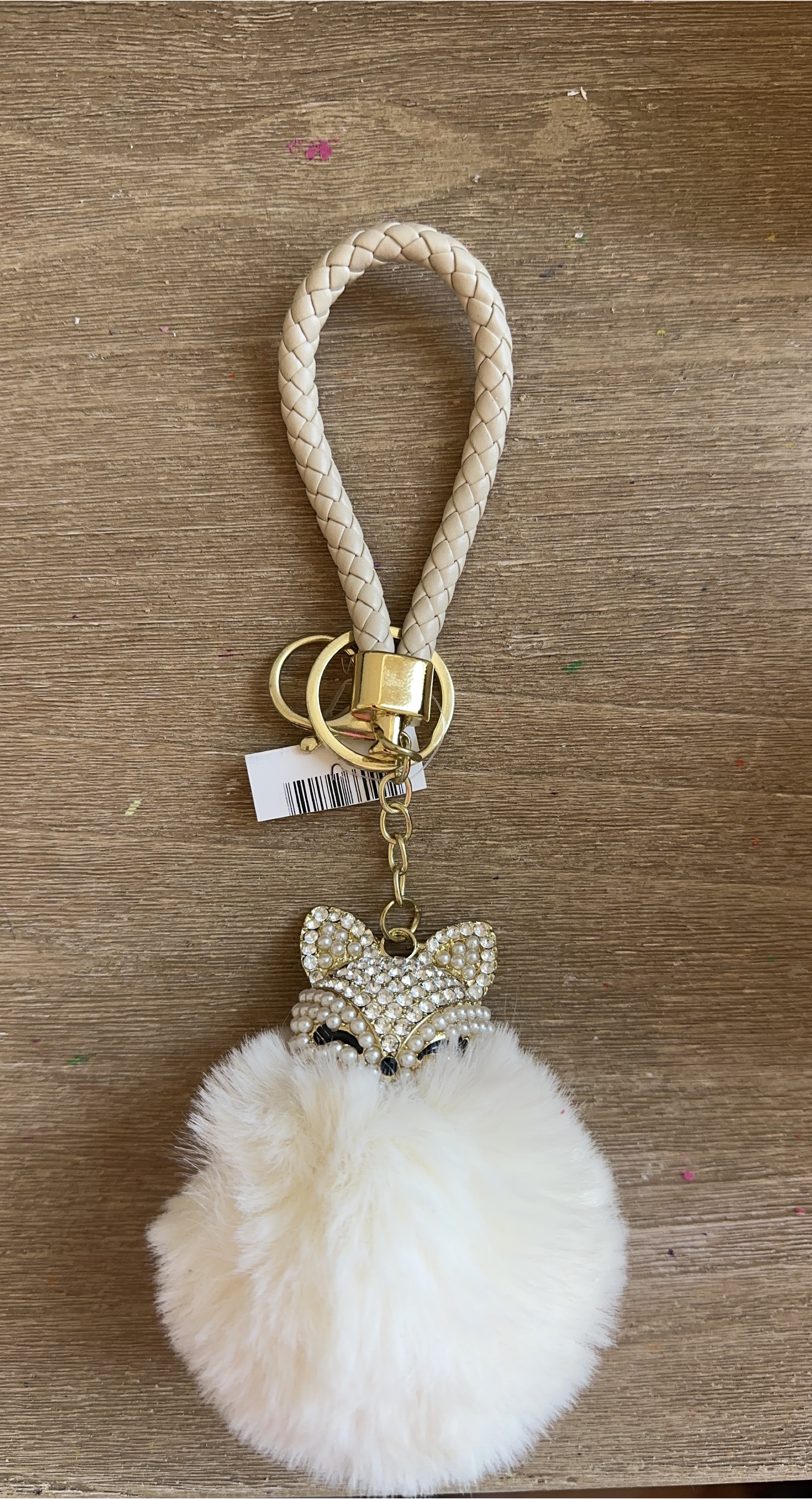 This is a cute fox rhinestone keychain with a cream-coloured faux fur pompom! It has a braided leather-like strap. Perfect for adding a bit of sparkle to your keys or bag!