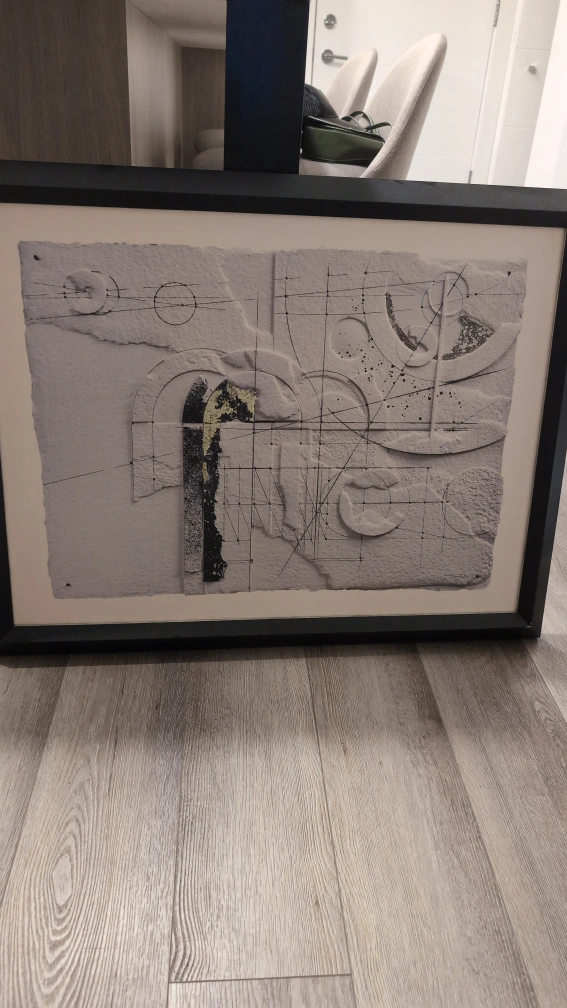 Selling a framed piece of abstract art. The frame is black and the art itself features a textured surface with geometric designs and linear elements. It's a unique piece that could add a modern touch to any room