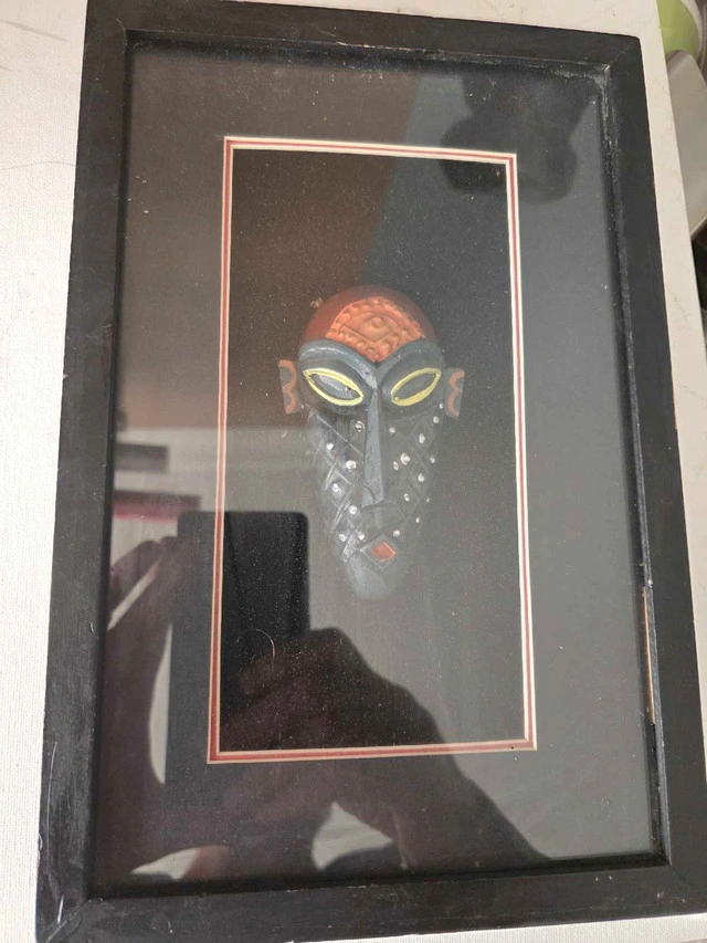 Adorn your walls with this striking framed African mask, a captivating piece that brings a touch of global artistry to your space. This unique artwork showcases intricate details and a bold design, perfect for adding character to any room. The piece shows some wear on the frame. If the ad is still up, it's still available!